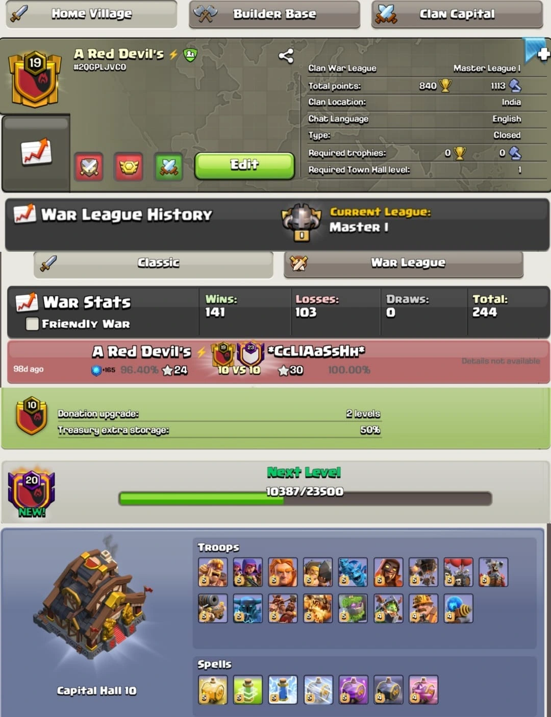 🔥NAME- MASTER | LVL 14.7🥵| 💥WARLOG W/L/D:54/106/0 | CWL League: GOLD 3🏆| CC: ALMOST 9 !!💥