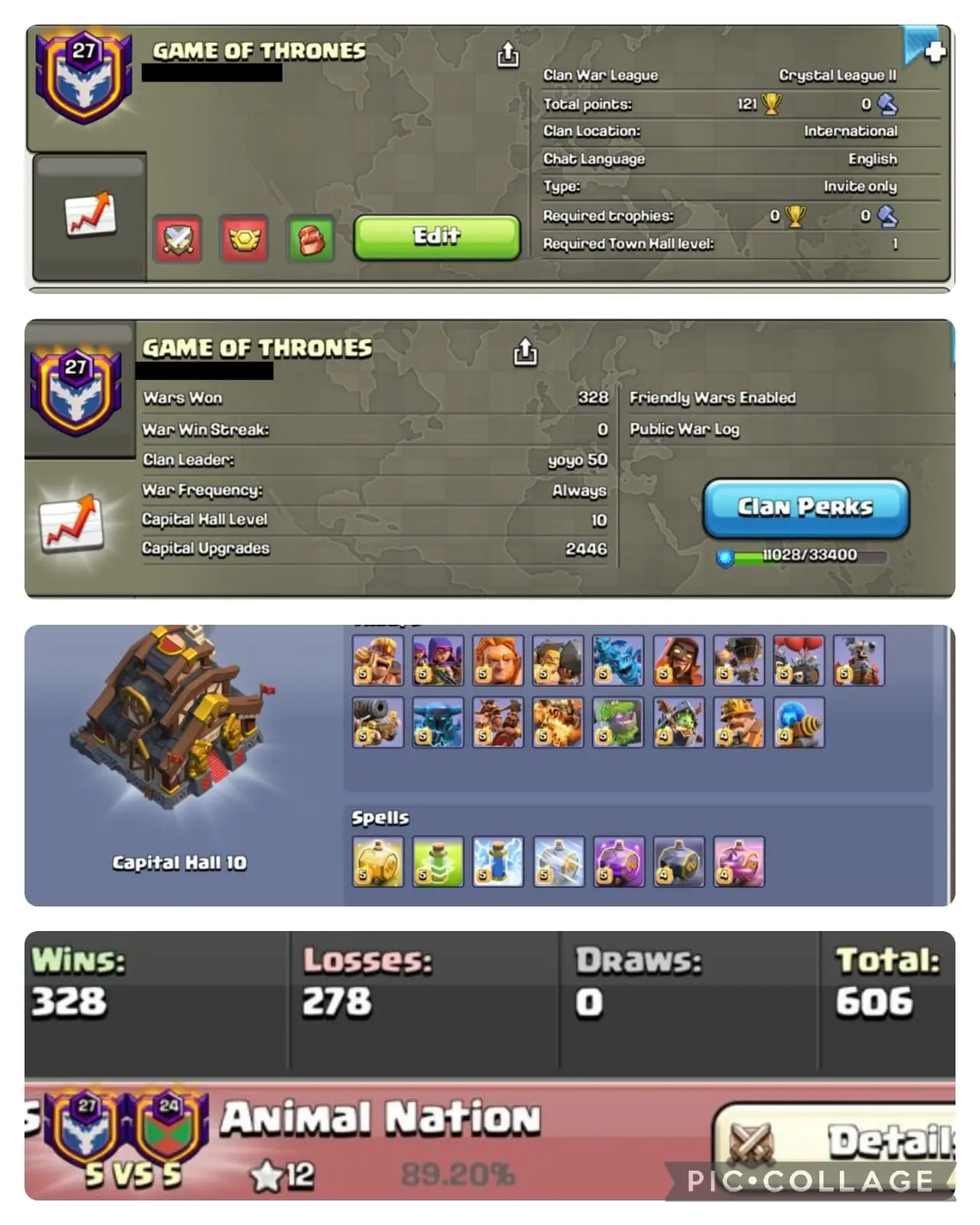 🔥LVL - 27🔥NAME- GAME OF THRONES | 💥WARLOG W/L/D:328/278/0 | CWL League: CRYSTAL 2🏆| CC: MAX 10 !!💥