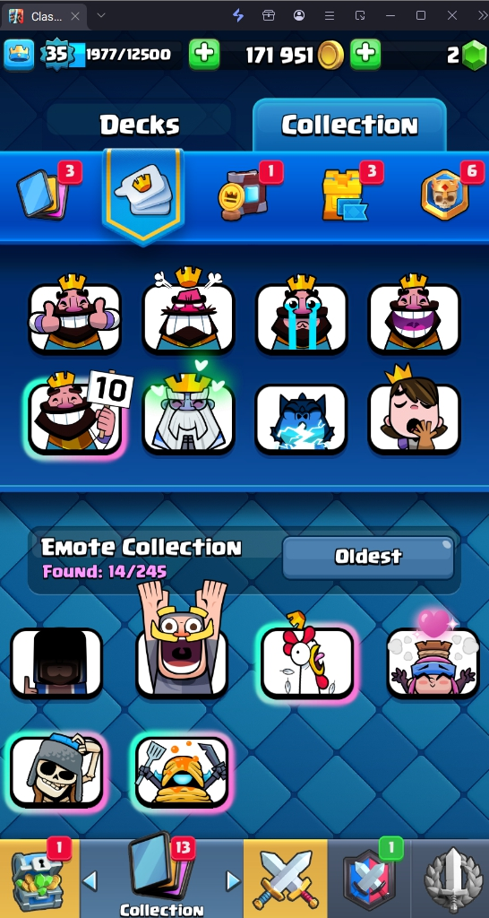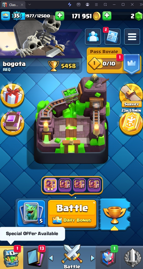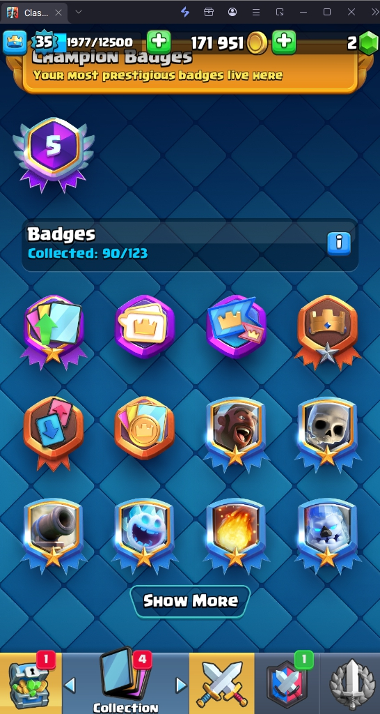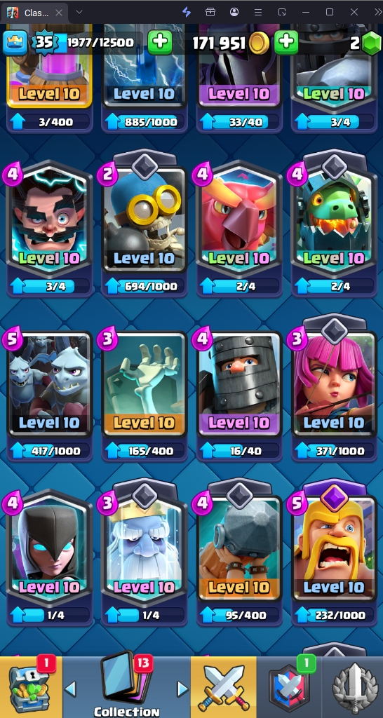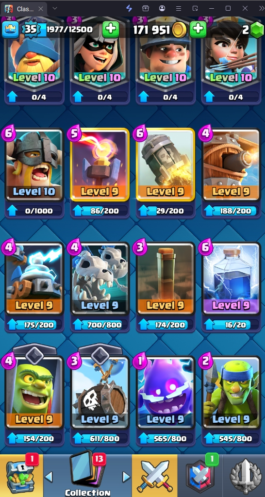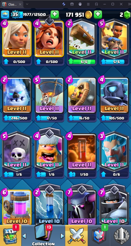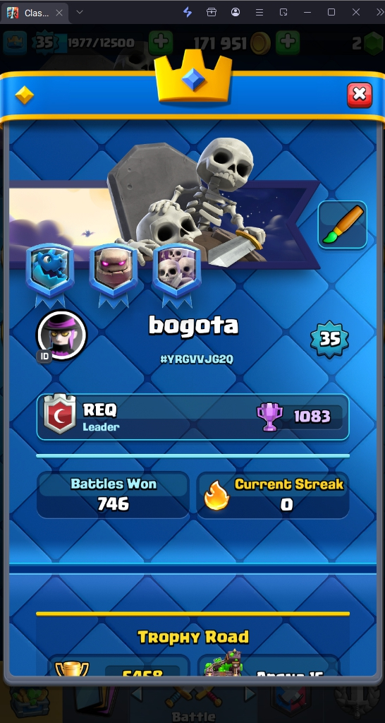 5458 TROPHIES 🏆 35 LVL 💯 KT 12 👑 113 CARDS ♦️ 0 MAX CARDS 👑 0 ELITE CARDS 🔮 3 EVO 💎 EMOTE 14 🎭 #2QG0PG9QL ⸱ TAG ACCOUNT ⚙️ LEGENDARY ARENA • 9000 TROPHIES 💎