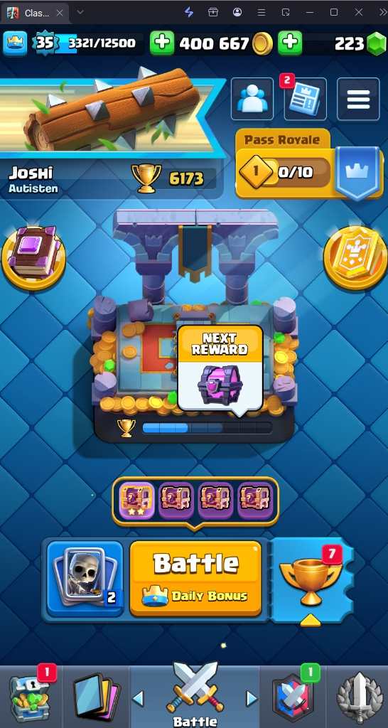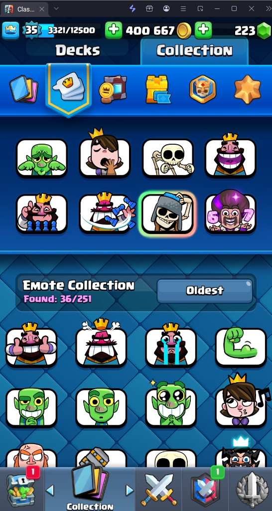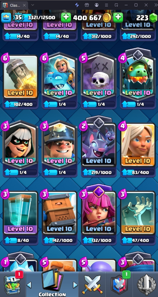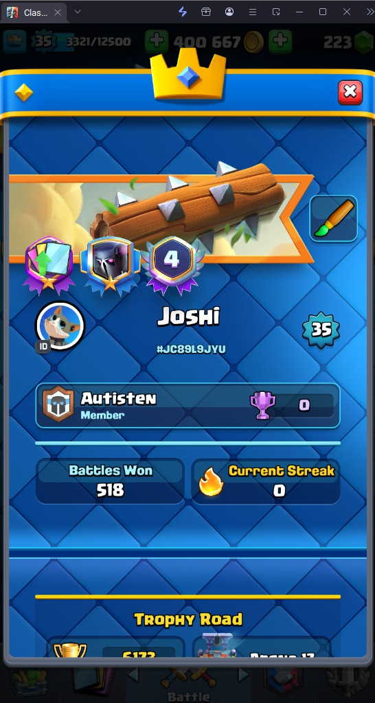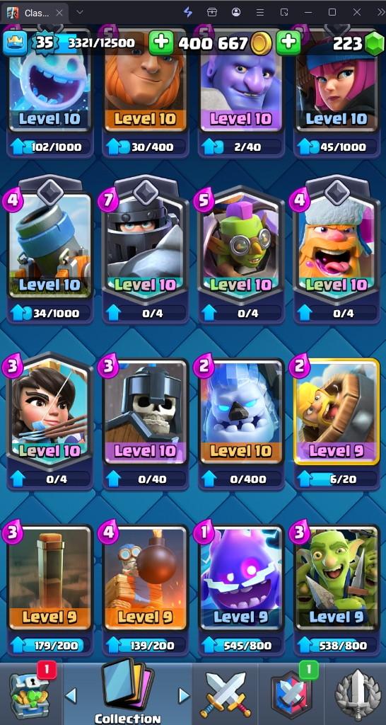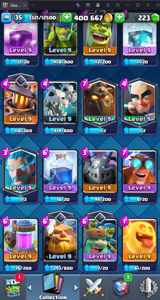 6173 TROPHIES 🏆 35 LVL 💯 KT 12 👑 114 CARDS ♦️ 1 MAX CARDS 👑 0 ELITE CARDS 🔮 3 EVO 💎 EMOTE 36 🎭 #20C20V2YP ⸱ TAG ACCOUNT ⚙️ LEGENDARY ARENA • 9000 TROPHIES 💎