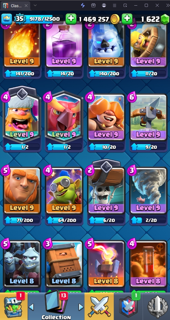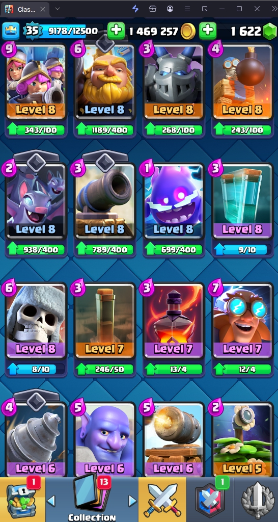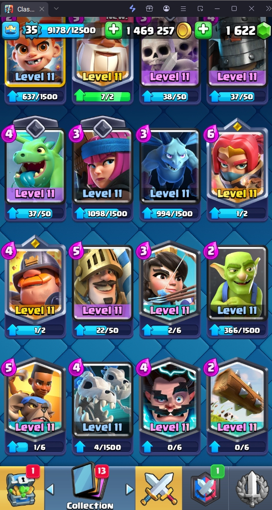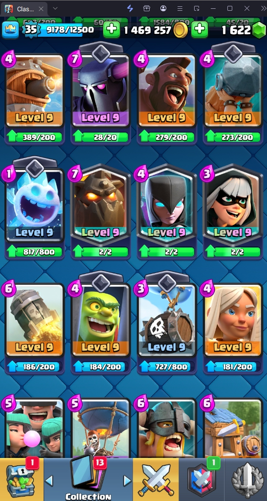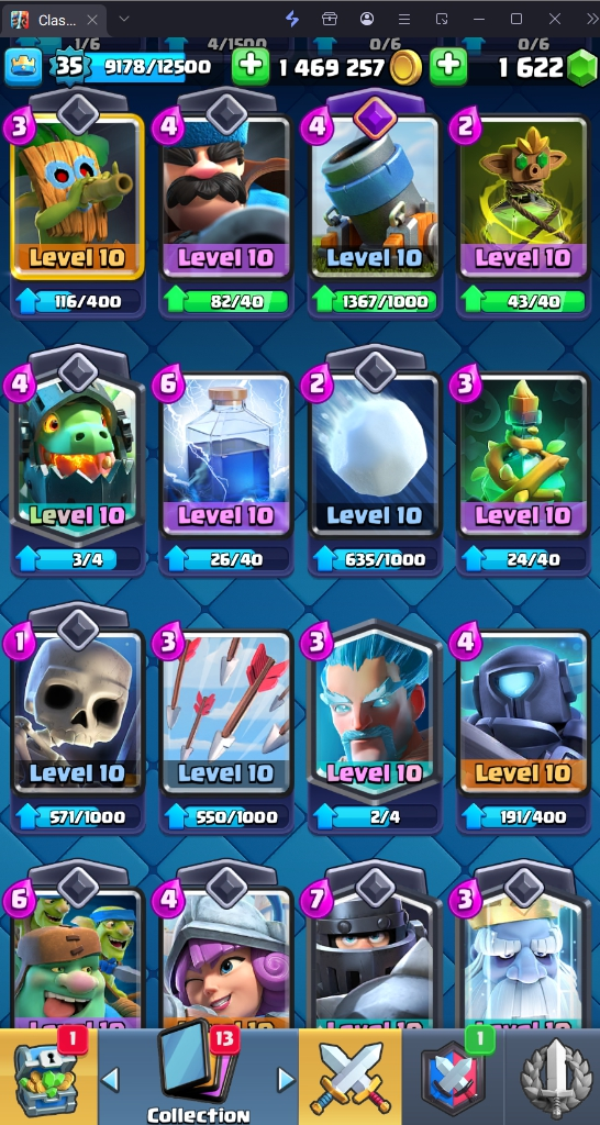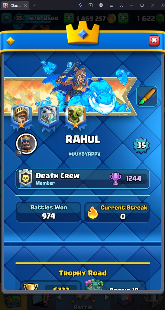 6733 TROPHIES 🏆 35 LVL 💯 KT 12 👑 115 CARDS ♦️ 1 MAX CARDS 👑 0 ELITE CARDS 🔮 6 EVO 💎 EMOTE 19 🎭 #VCCGVGPYP ⸱ TAG ACCOUNT ⚙️ LEGENDARY ARENA • 9000 TROPHIES 💎
