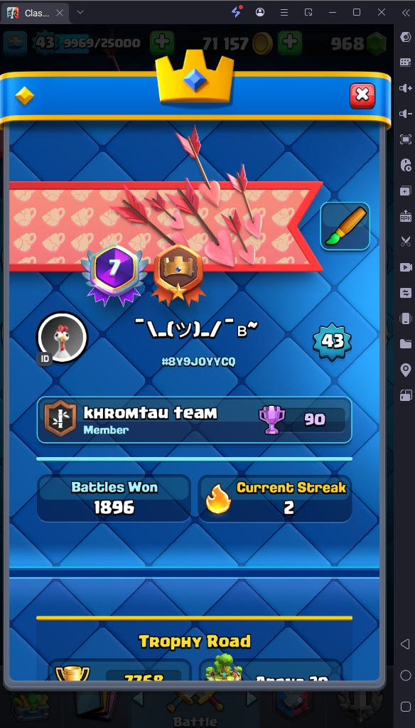 7768 TROPHY 🏆 43 LVL 💯 KT 14 👑 117 CARDS ♦️ EMOTE 23 🎭 #8Y9J0YYCQ ⸱ TAG ACCOUNT ♥️