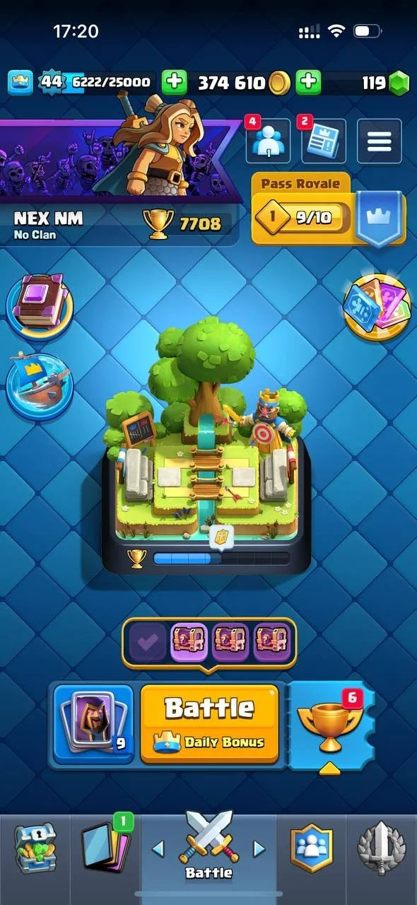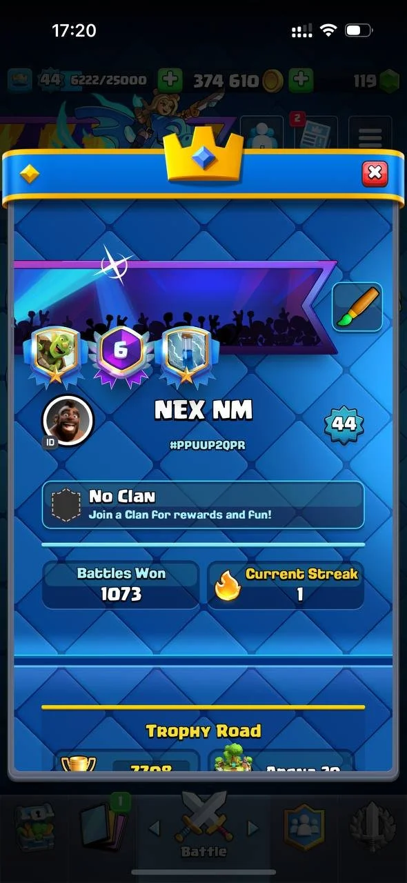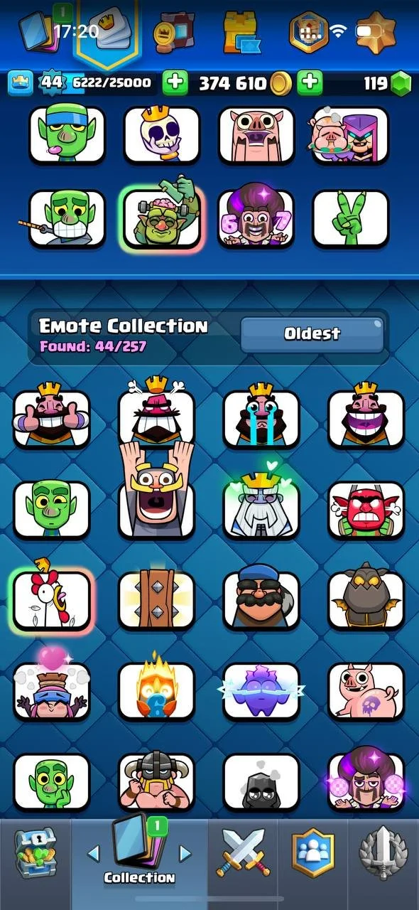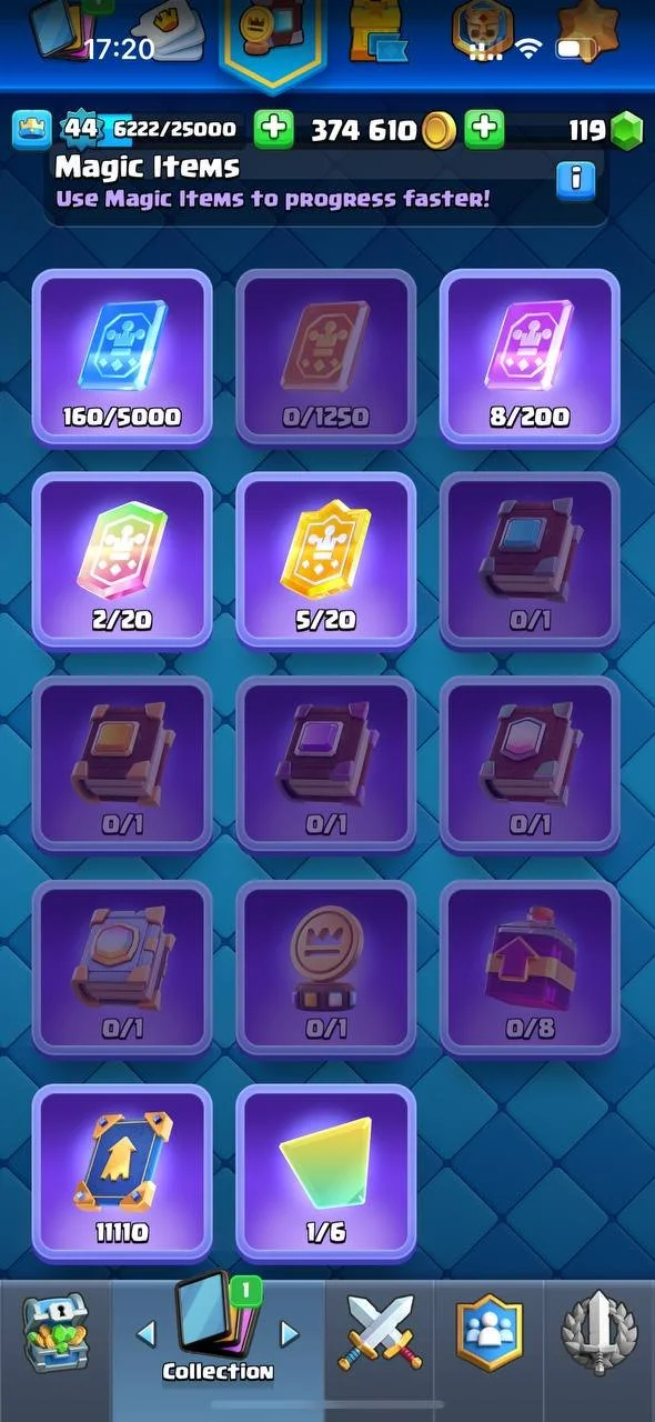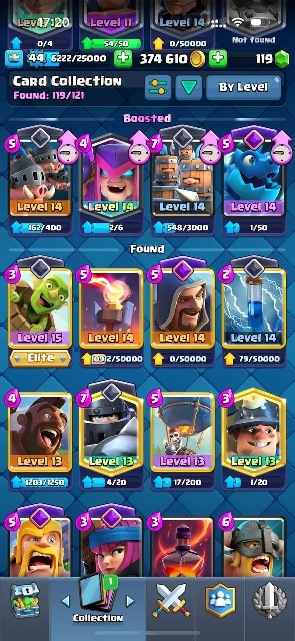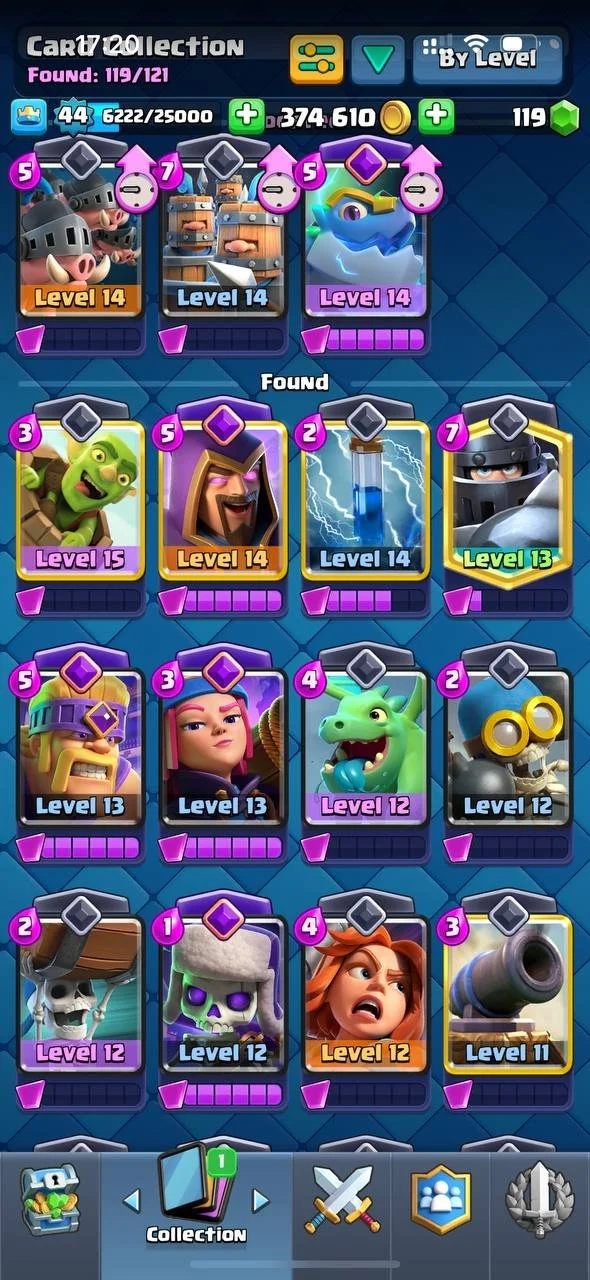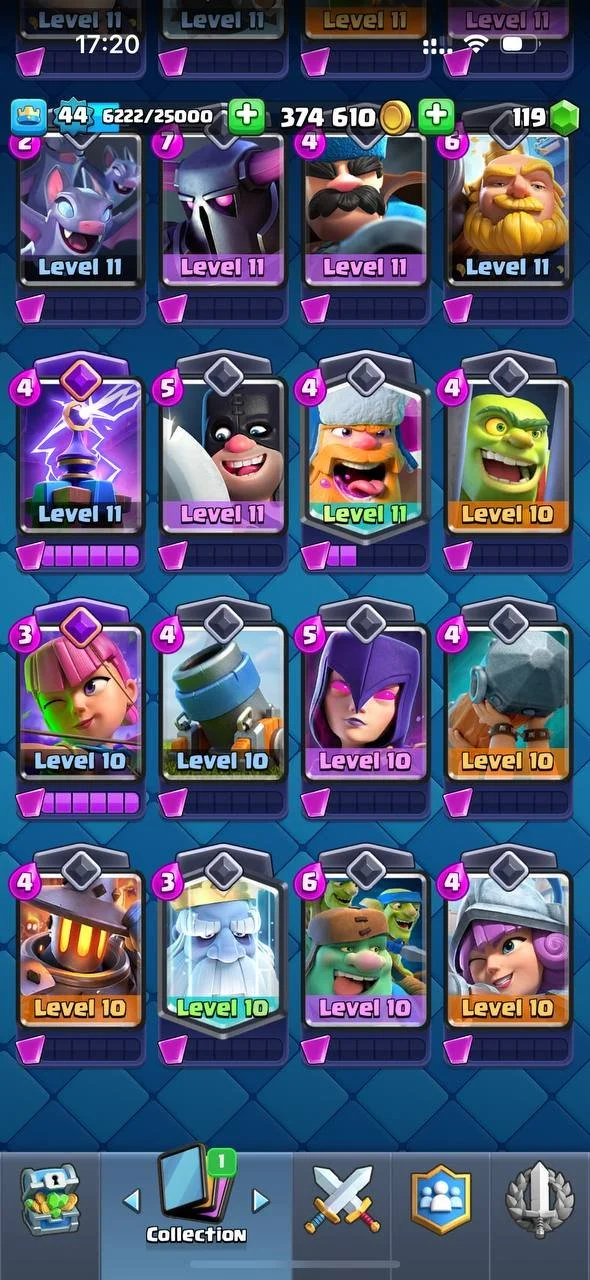 7.7k , lvl 44, 1 lvl 15 + 4 lvl 14, deck with Hog, 7 evolutions, 44 emoji,
