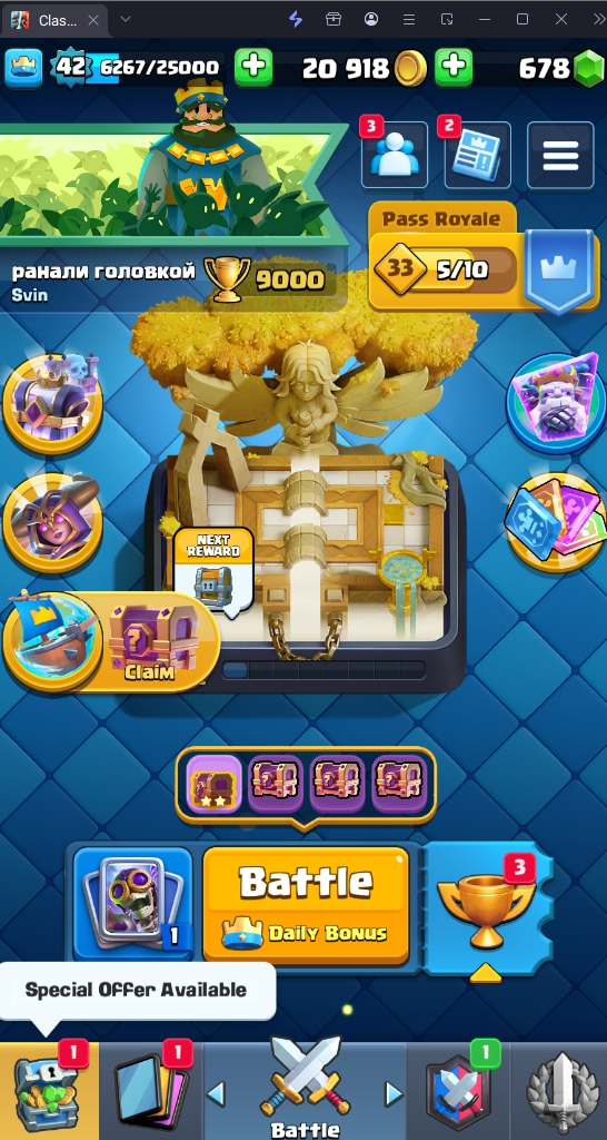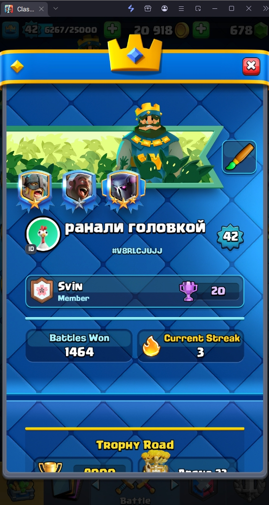 9000 TROPHY 🏆 42 LVL 💯 KT 14 👑 119 CARDS ♦️ 3 MAX CARDS 👑 1 ELITE CARDS 🔮 9 EVO 💯 EMOTE 37 🎭 #V8RLCJUJJ ⸱ TAG ACCOUNT ♥️