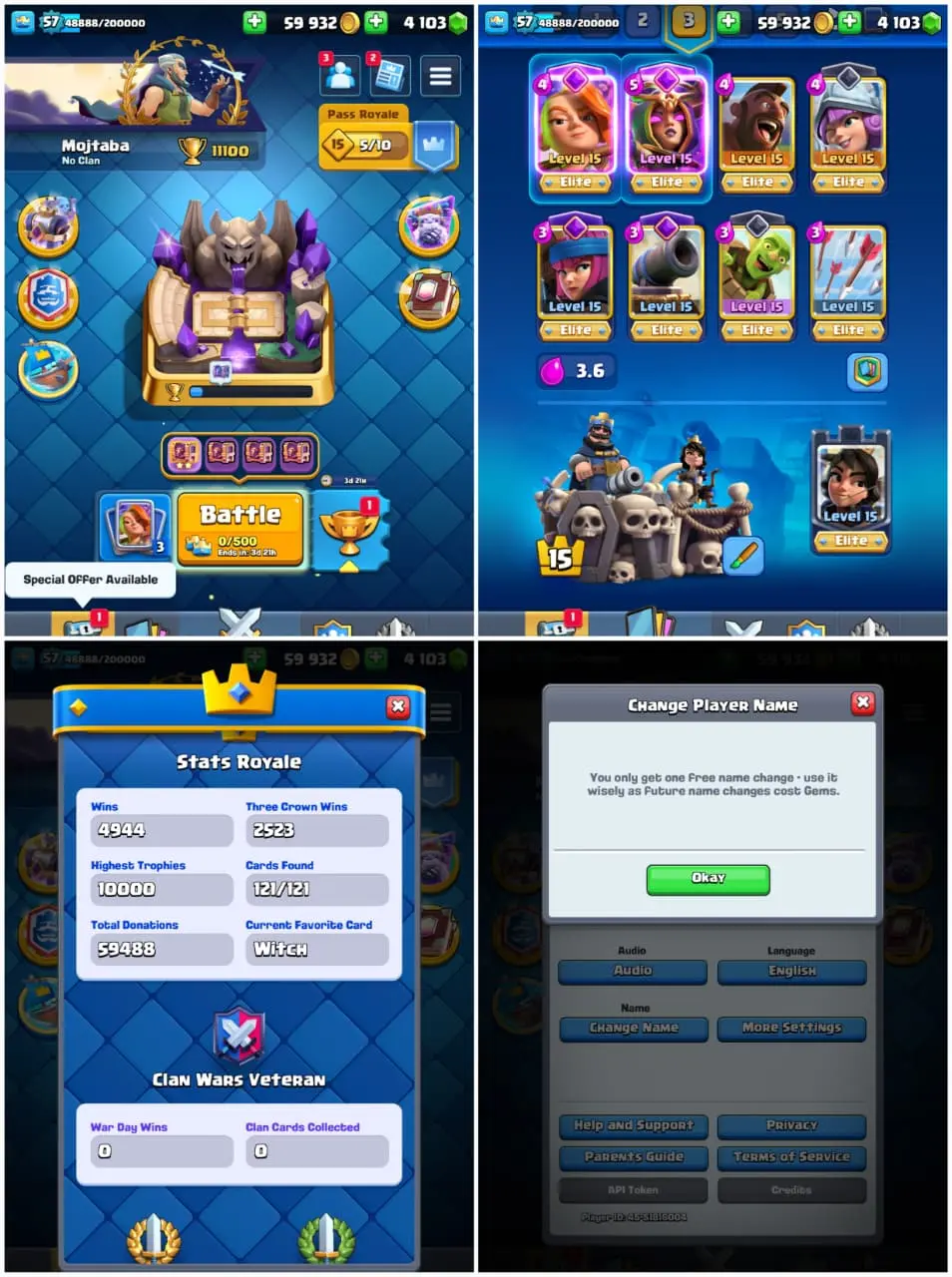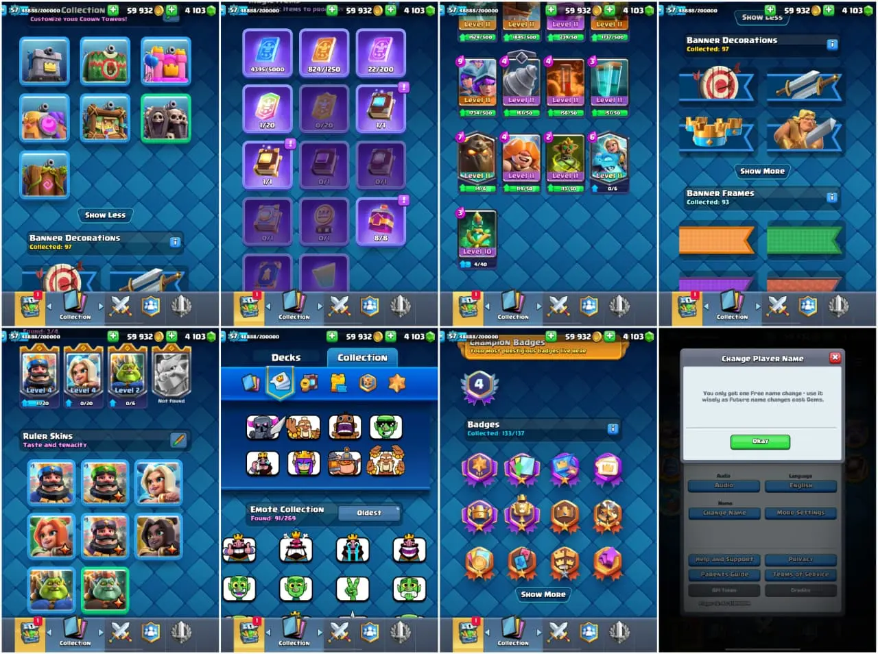 👑 Classic Level 57 🏰 KT 15 😎 91 Emotes 🏆 11100 Trophies ⚔️ 70 Max Cards {10 Elites} 🌀 12 Evos 🎨 97 Banners & 93 Frames 🔄 Name Changable📱 Android & iOS ⚡ Instant Delivery