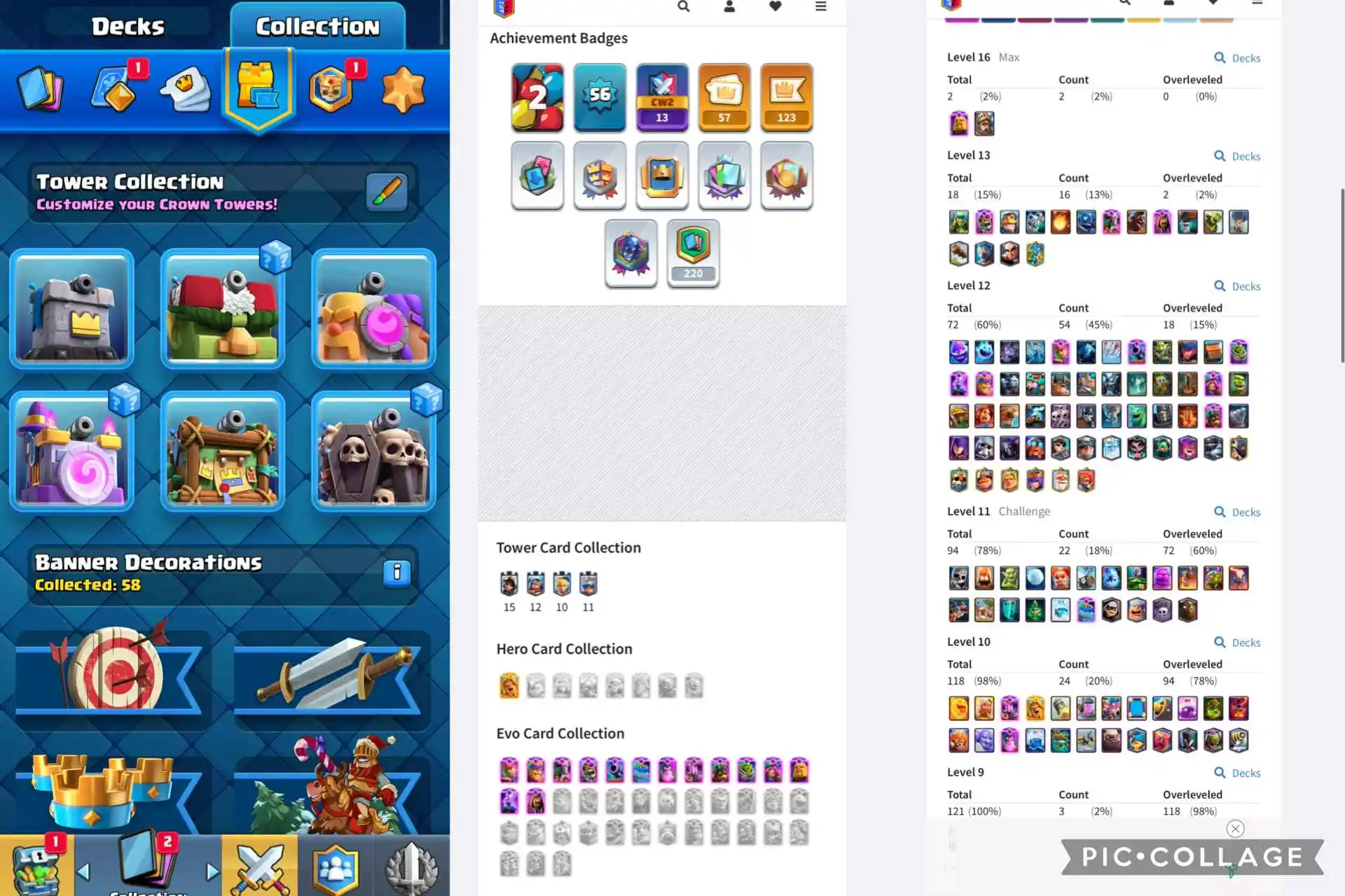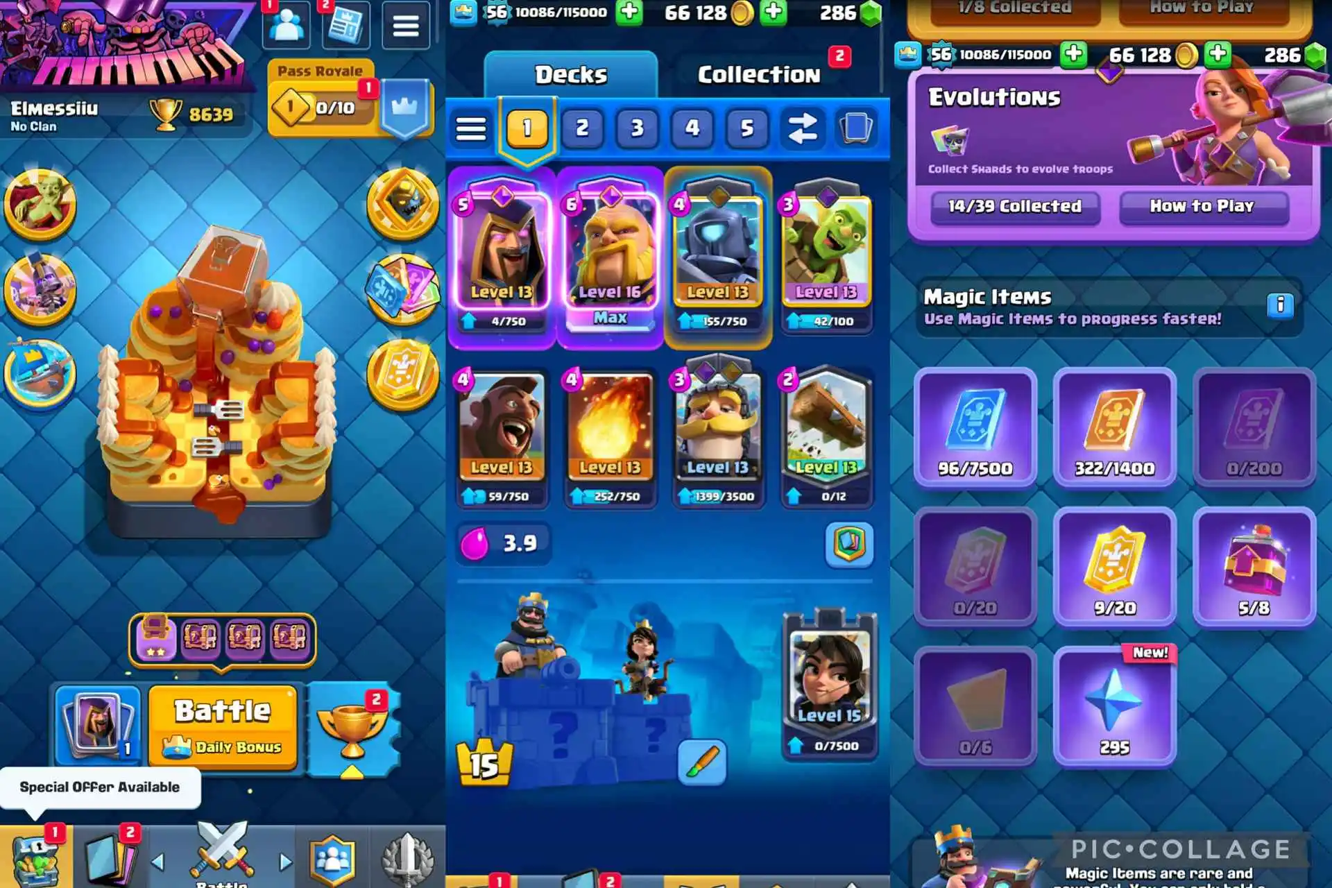 Level[56]-Exclusive Evolution[14x]-Hero card [1x]-Level16[x2]- unlocked card[120x]-Kt15-Kt Skin[6x]-Cool Emote[57x-Trophy[8500]