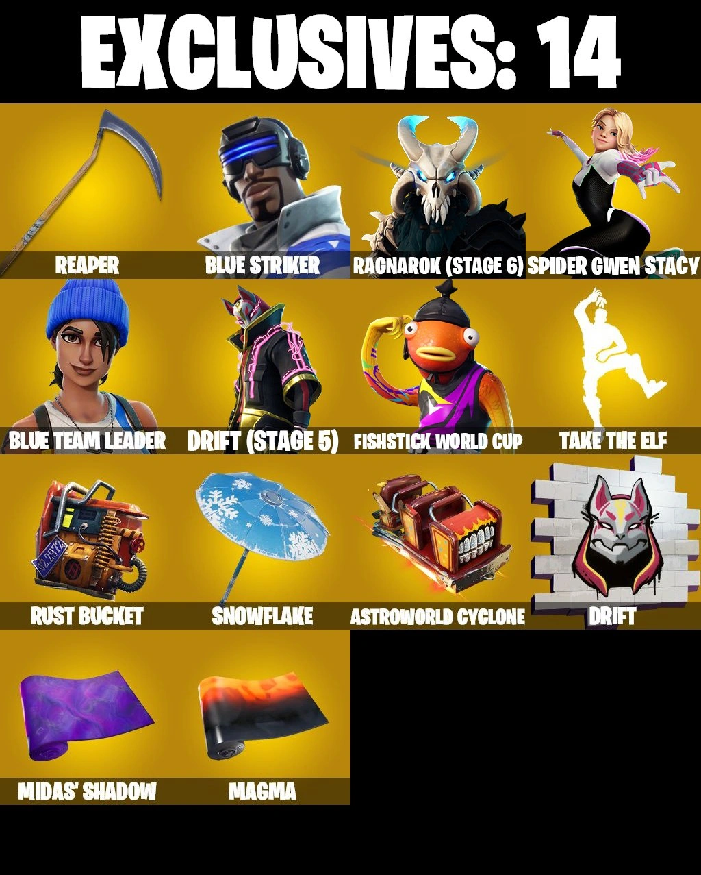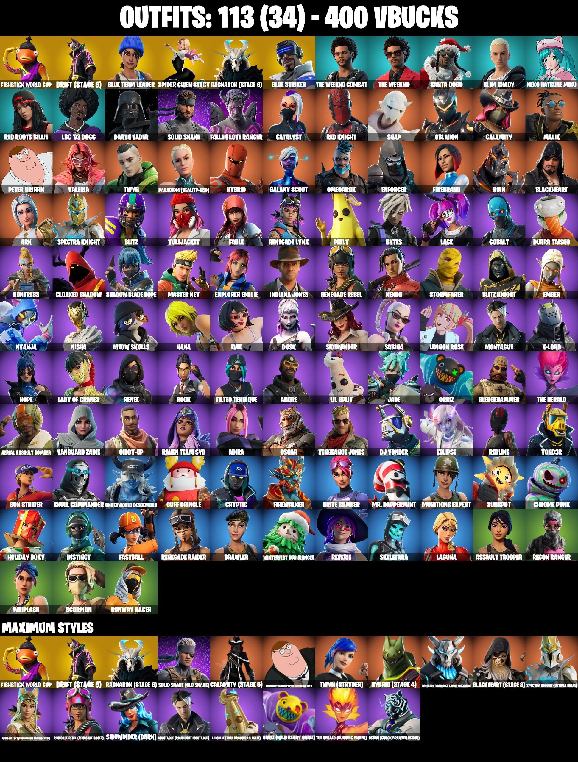 ❤️ 113 SKINS ❤️ FISHSTICK WORLD CUP ❤️ FIREBRAND ❤️ SPIDER-GWEN STACY ❤️ GET GRIDDY ❤️ WHIPLASHNEKO HATSUNE MIKU ❤️ SLIM SHADY ❤️ EVIE ❤️ LADY OF CRANES ❤️ ROOK ❤️ REVERIE ❤️ MEOW SKULLS ❤️ PEELY ❤️ ASTROWORLD CYCLONE