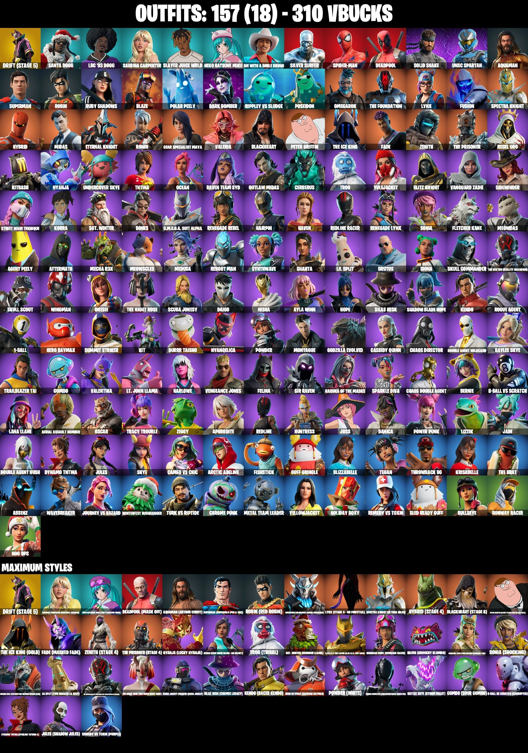 157 SKINS | TRACY TROUBLE | GET GRIDDY | SPIDER-MAN | OUTLAW MIDAS | BTS EMOTE | NEKO HATSUNE MIKU MAX | JULES MAX | HAYLEE SKYE MAX | CHAOS DIRECTOR MAX | SILAS HESK | SKULL SCOUT | LANA LLANE | BULLSEYE | WAVEBREAKER | NOG OPS |