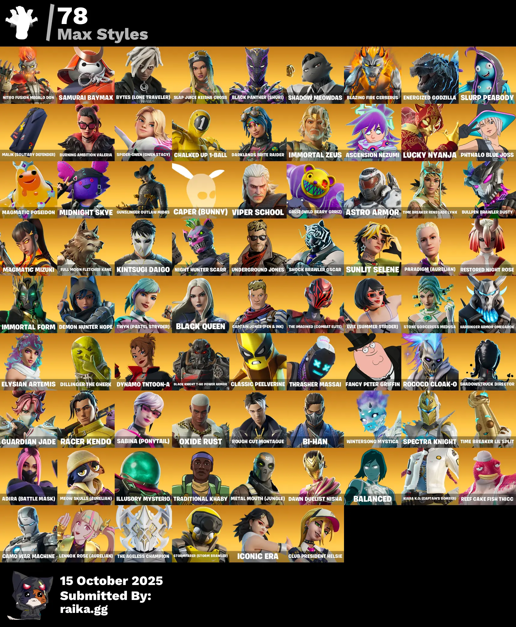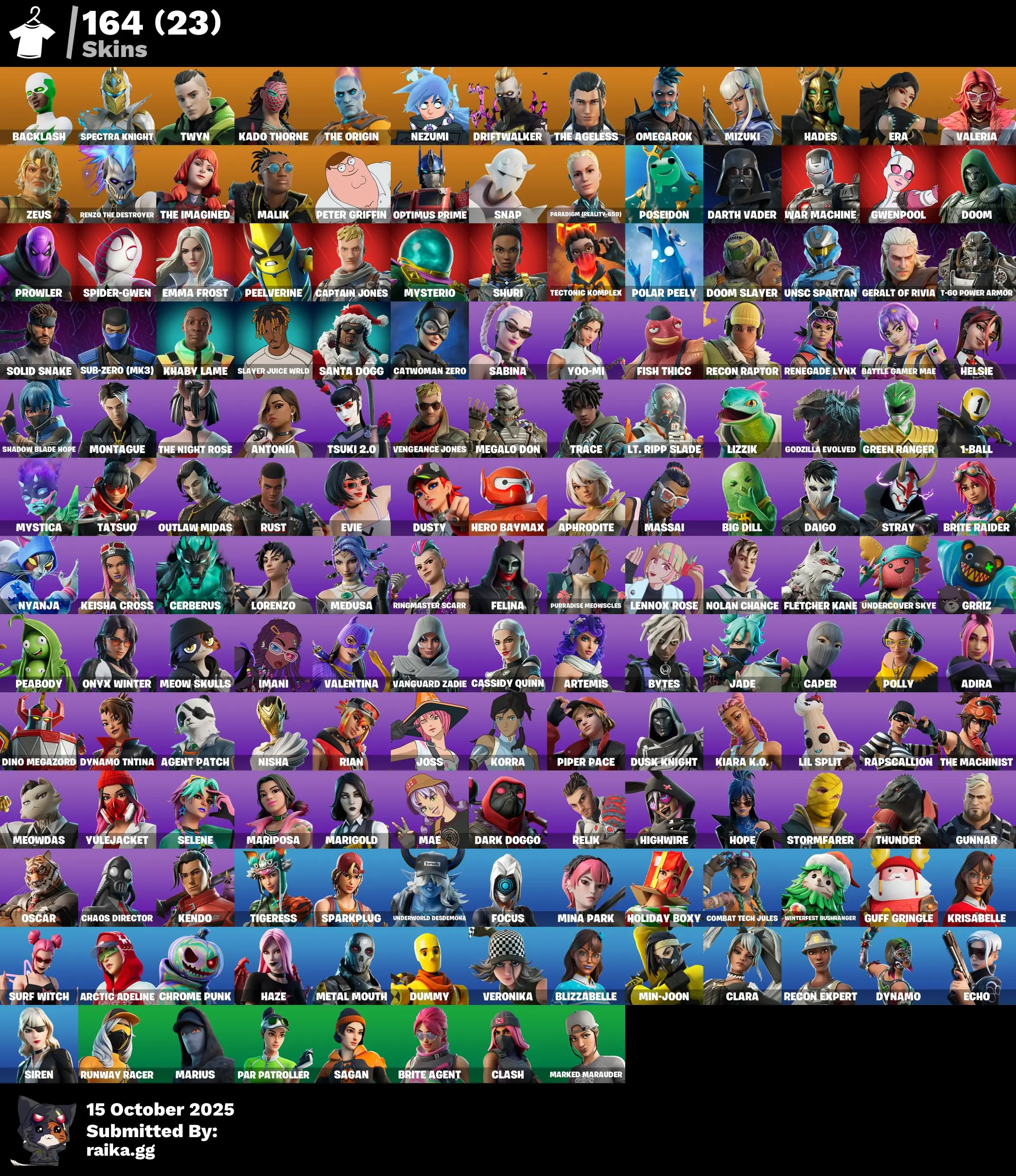 164 skins | The Imagined🎃Nezumi🎃The Origin🎃Paradigm (Reality-659)🎃Era🎃Optimus Prime🎃Spectra Knight🎃The Ageless🎃Driftwalker🎃Snap🎃Hades🎃Zeus🎃Omegarok🎃Mizuki🎃Poseidon🎃Backlash🎃Kado Thorne🎃Peter Griffin🎃Malik🎃Valeria D5076