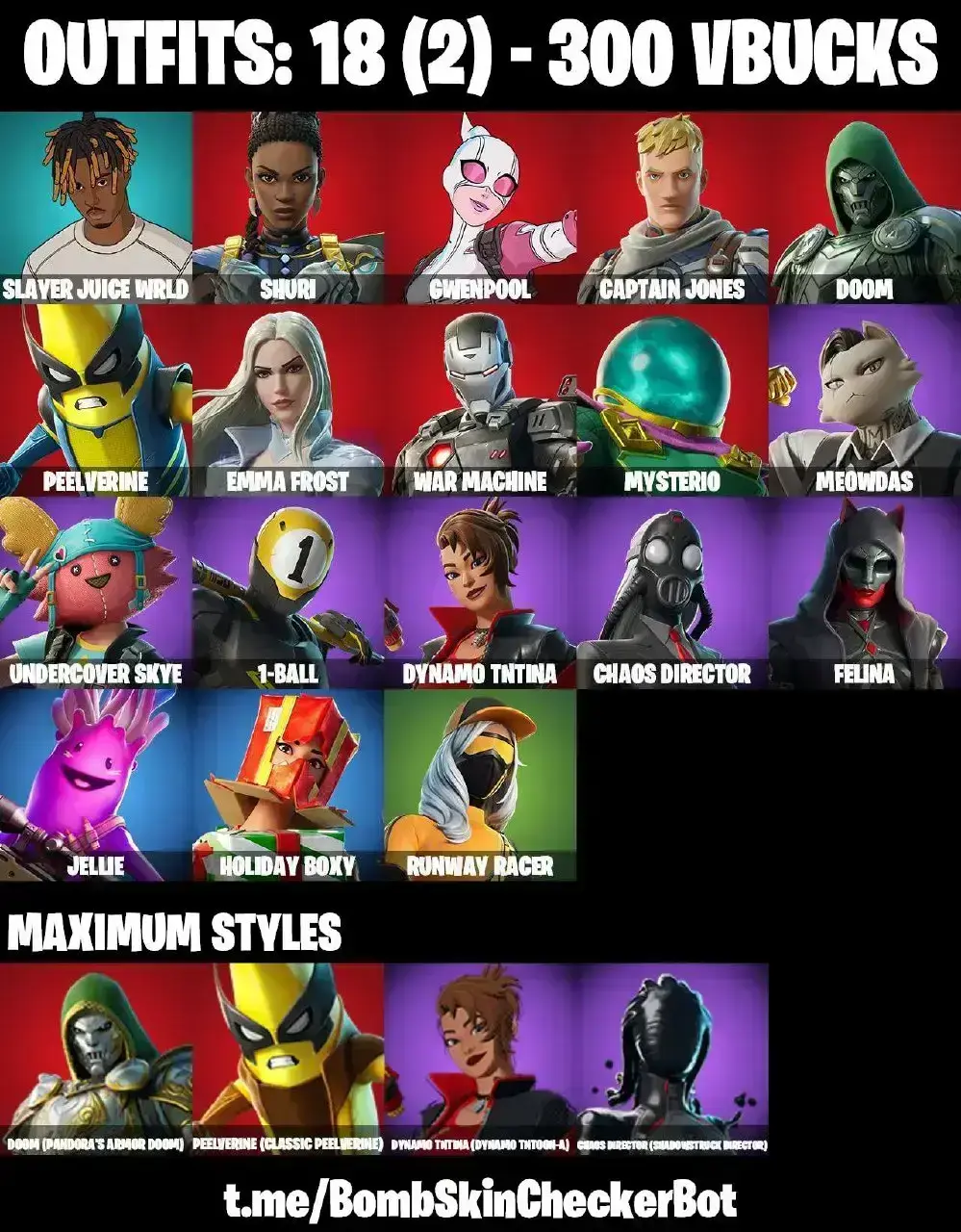 18 SKINS | SLAYER JUICE WRLD | RUNWAY RACER | PEELVERINE MAX | MEOWDAS | DYNAMO TNTINA | FIENDISH WAND | PEELY WHIP | CAN PLAY ON PSN,XBOX,PC,NINTENDO,MOBILE | 300 VBUCKS | FULL EMAIL ACCESS