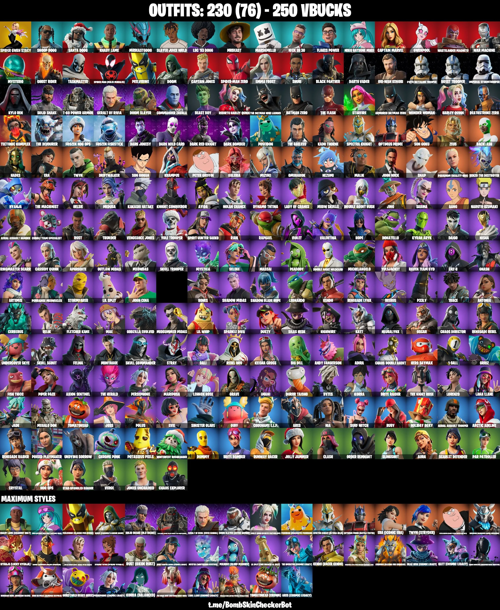 230 Skins| Spidergwen Stacy, Commander Zavala, Candy Axe, Skull Trooper, MrBeast6000 , MrBeast, Naruto, Son Goku , Miles Morales|Full Access