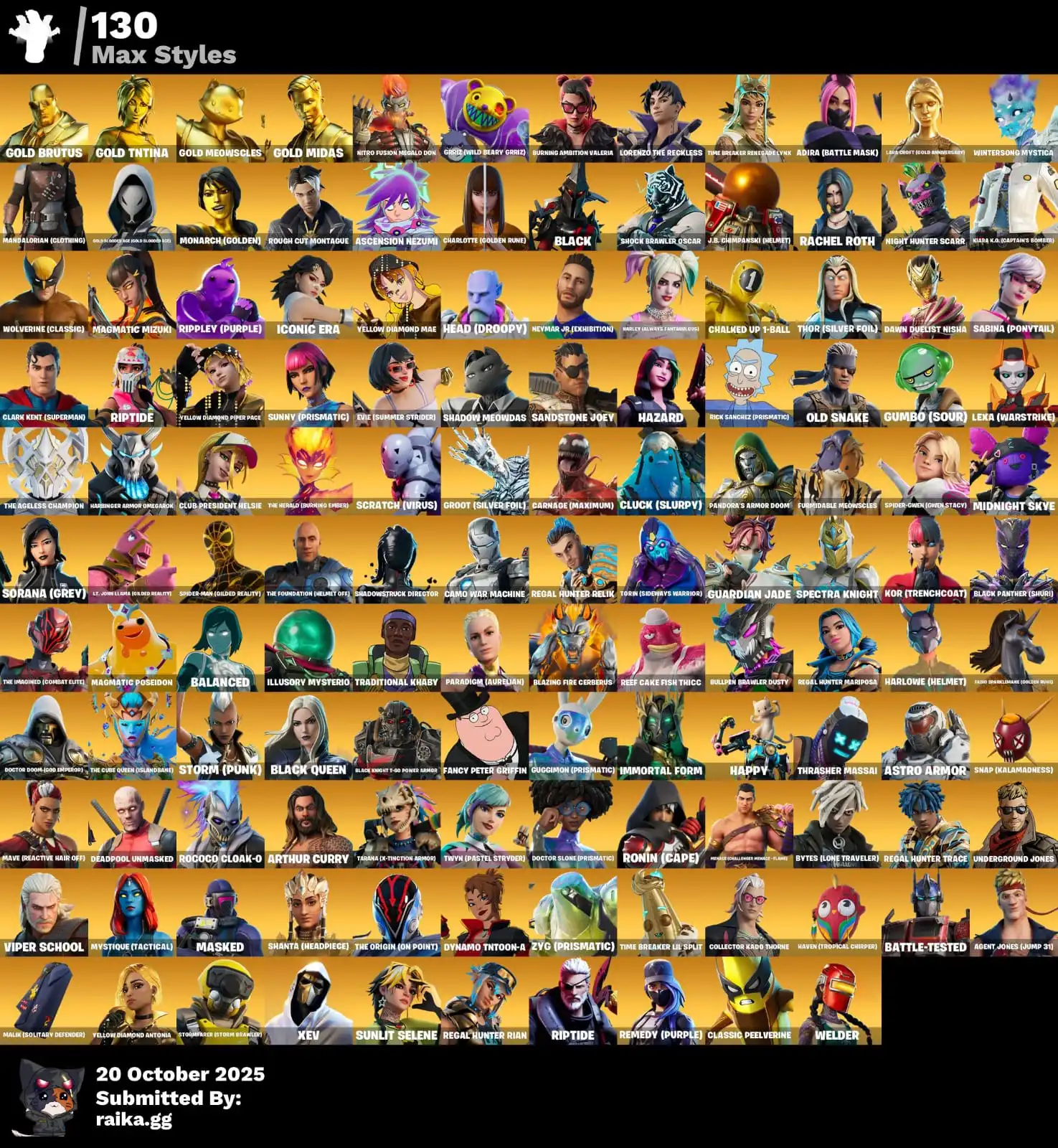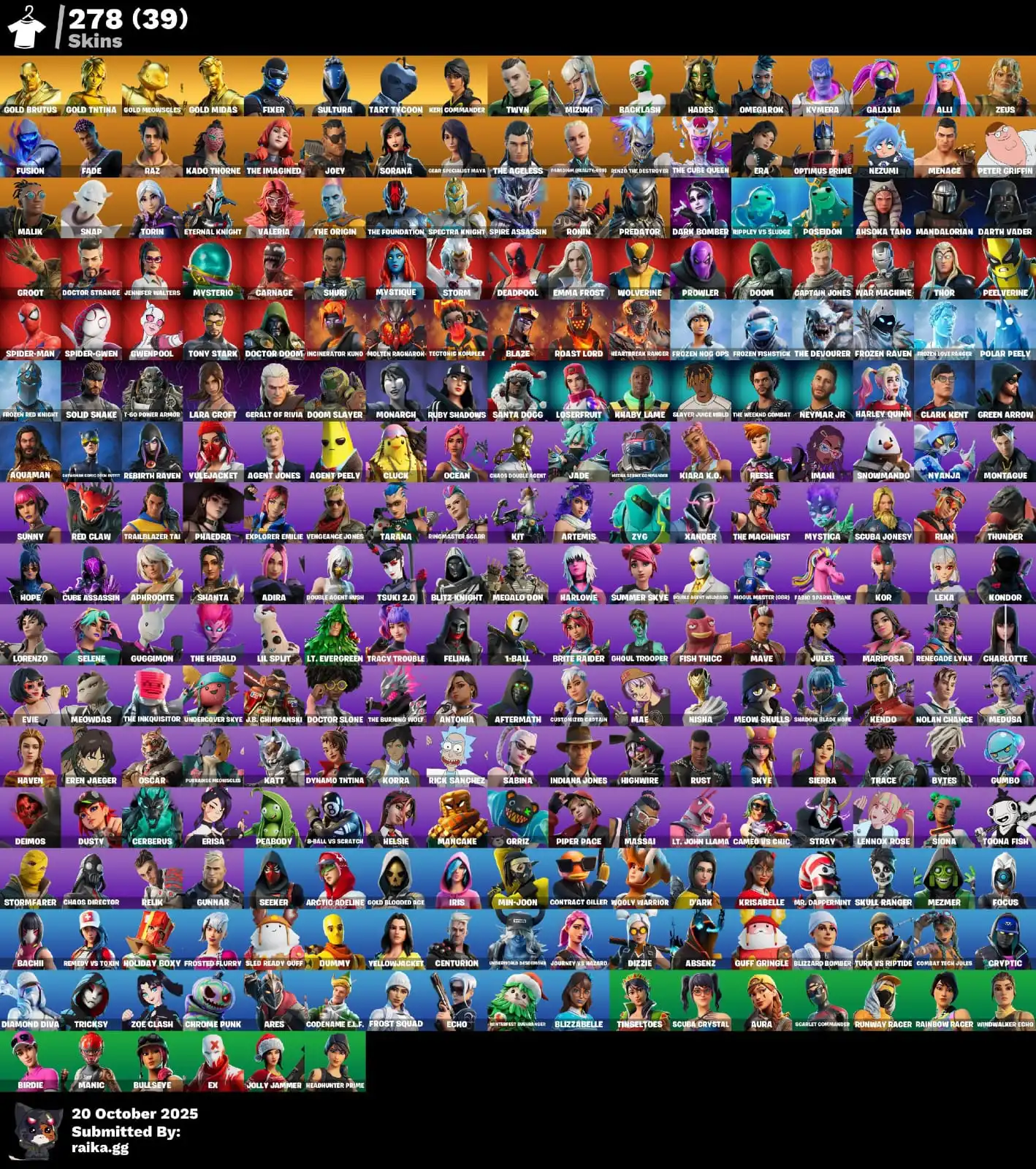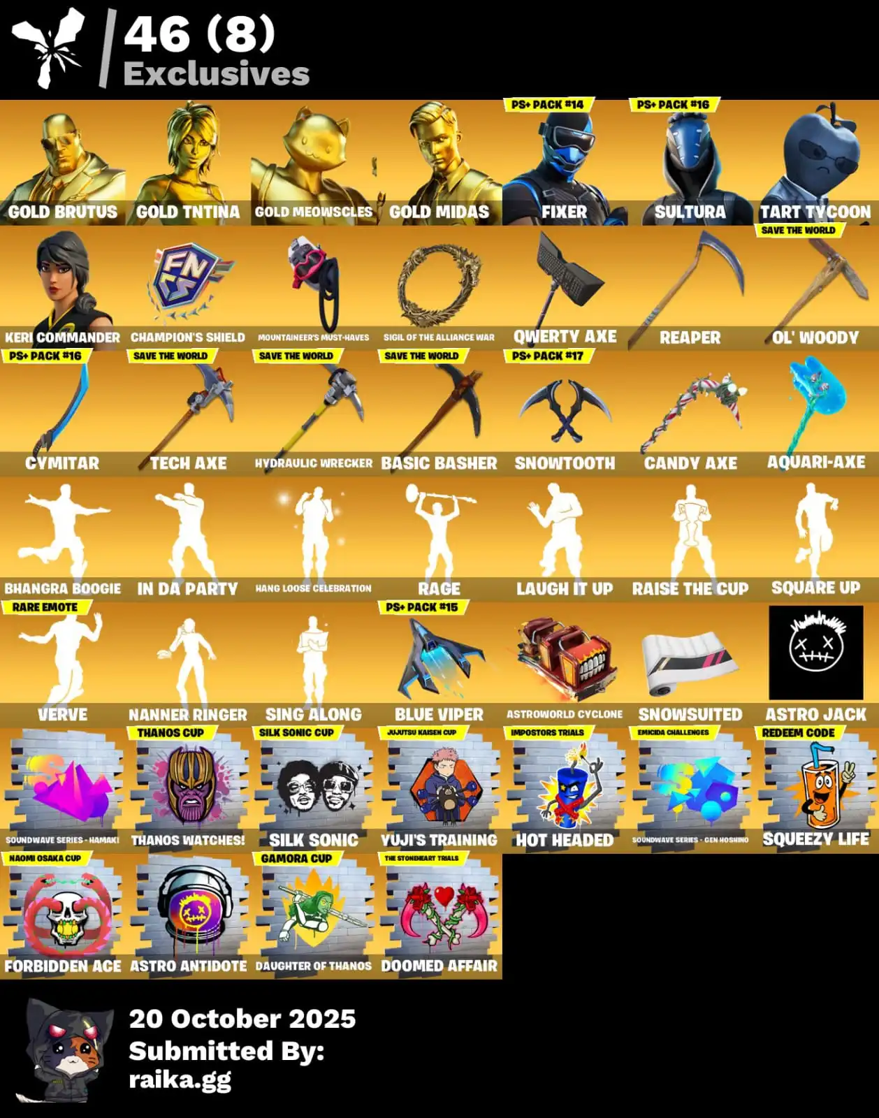🔥 278 Skin  ⭐ Save the World exclusives 🚀 Tart Tycoon | Reaper Pickaxe | Astro Jack | Verve | Fixer | Champions Shield / Keri Commander  |  Silk Sonic | Naomi  Osaka | Gen Hoshino | FNCS Cup sprays  |  Sultura | Fixer | Gold Midas | Commander |