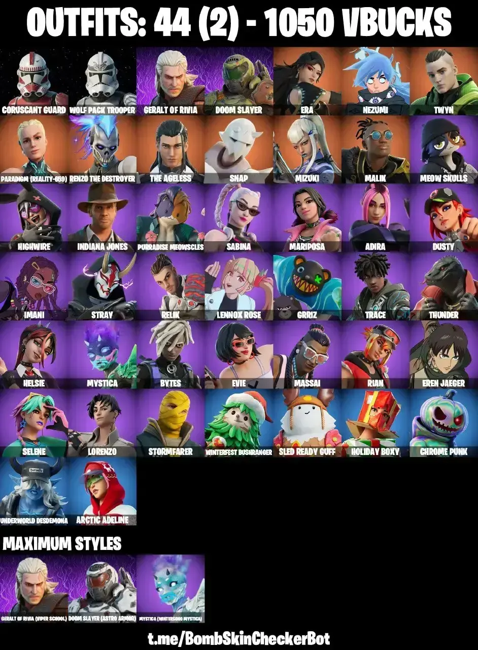 44 SKINS | CORUSCANT GUARD | WOLF PACK TROOPER | EREN JAEGER | MYSTICA MAX | MARIPOSA | HELSIE | EVIE | BYTES | LENNOX ROSE | CAN PLAY ON PSN,XBOX,PC,NINTENDO,MOBILE | 1050 VBUCKS | FULL EMAIL ACCESS