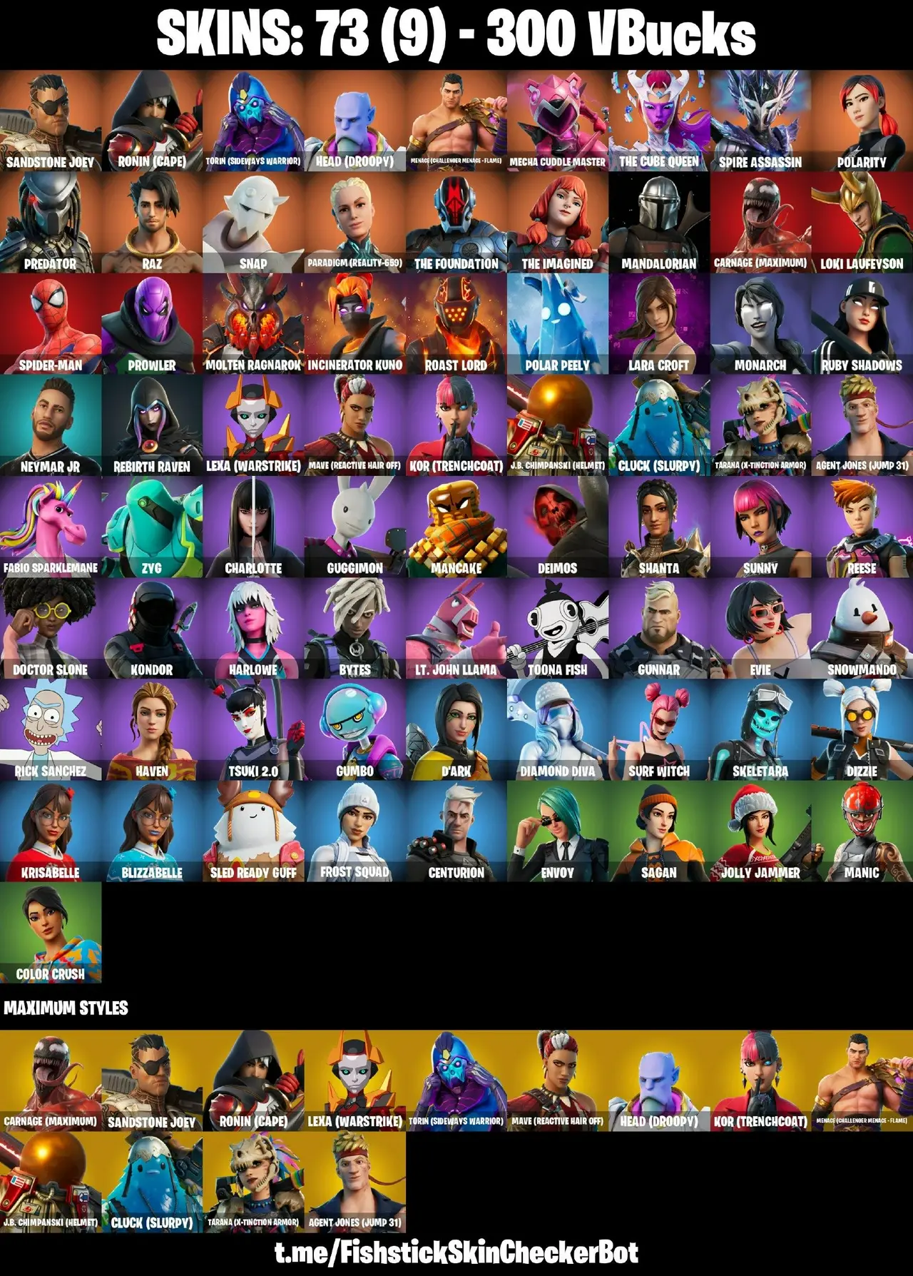 💫 73 Skins [PC/PSN/XBOX] Sandstone Joey 🏝️ Ronin ⚔️ Torin 🌠 Head 🎯 Menace 💪 Mecha Cuddle Master 🧩 The Cube Queen 💎 Spire Assassin 🛡️ Polarity 🔆 Predator 🦹 Raz 🌪️ Snap 🧤 Paradigm 🚀 The Foundation 🏰 300 V-Bucks 💰 FULL ACCESS 🔑 FO442