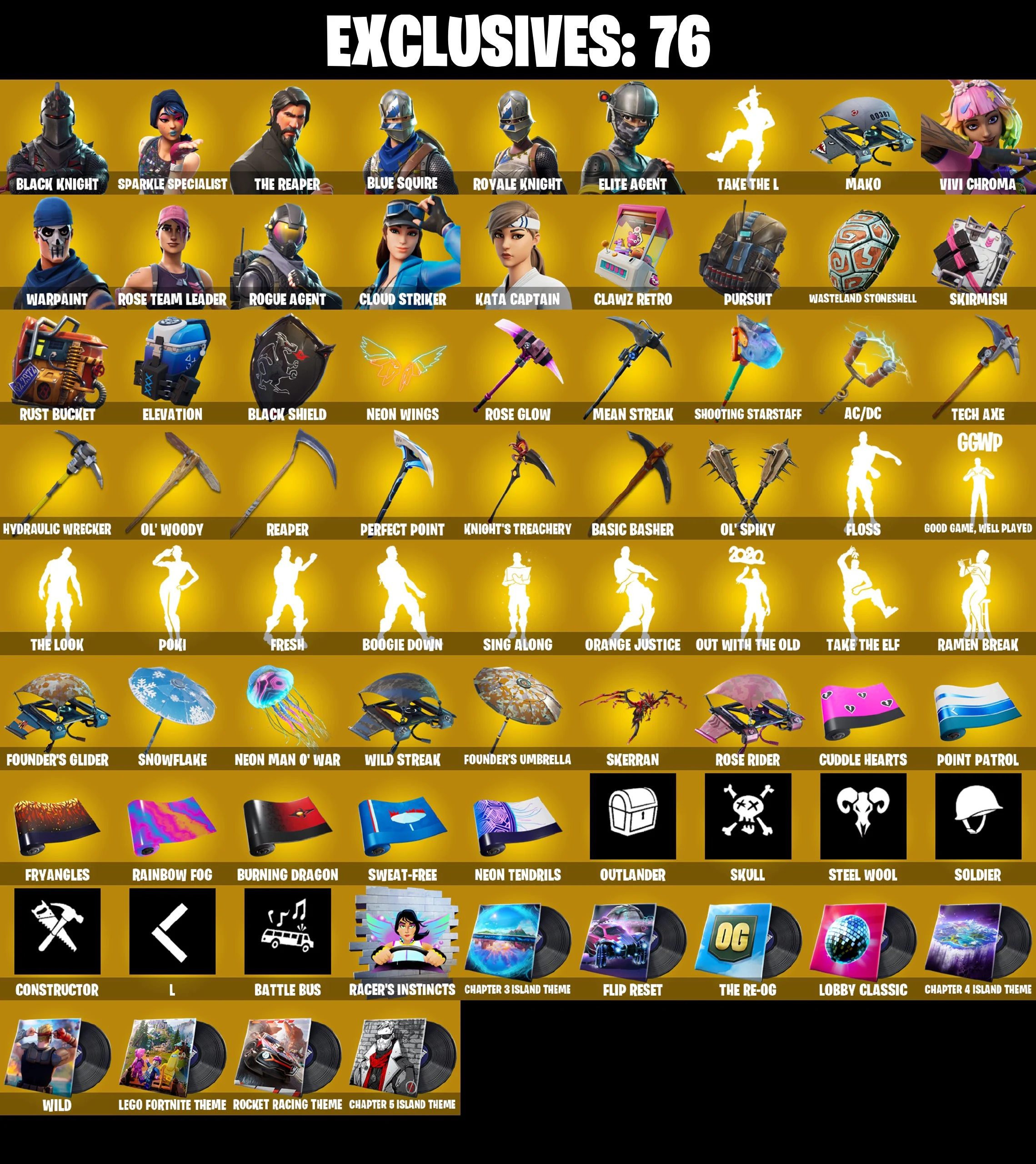 💥🌟💥 EXCLUSIVE OFFER 💥🌟💥 198 SKINS 💎 BLACK KNIGHT 💎 POKI 💎 THE LOOK 💎 FLOSS 💎 TAKE THE L 💎 THE REAPER 💎 ROYALE KNIGHT 💎 ELITE AGENT 💎 VIVI CHROMA 💎 ROGUE AGENT 💎 FULL ACCESS