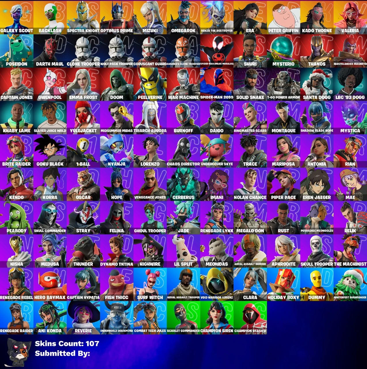💥🌟 LIMITED OFFER 🌟💥 107 SKINS 💎 RENEGADE RAIDER 💎 AERIAL ASSAULT TROOPER 💎 GALAXY SCOUT 💎 BACKLASH 💎 SPECTRA KNIGHT 💎 OPTIMUS PRIME 💎 MIZUKI 💎 OMEGAROK 💎 RENZO THE DESTROYER 💎 ERA 💎 PETER GRIFFIN 💎 FULL ACCESS 💎