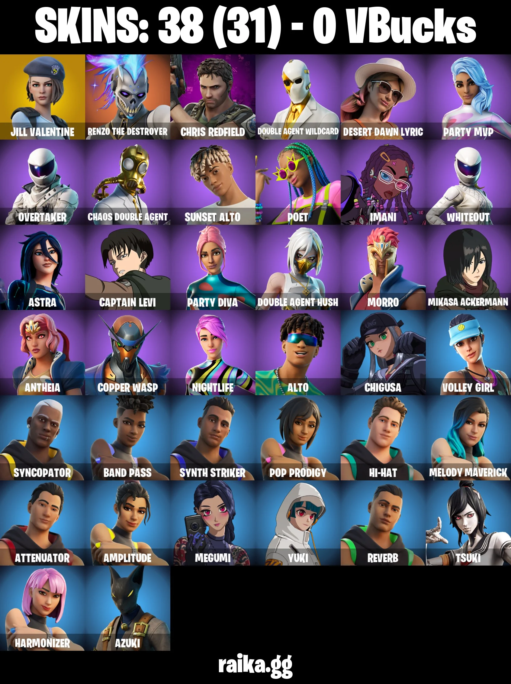 Original Email ✅ Inactive for 3 years | 38 skins | Captian Levi | Mikasa Ackermann | Jill Valentine | Renzo the Destroyer | Chris Redfield | Double Agent Wildcard | Desert Dawn Lyric | Party MVP | Overtaker | 0 VB
