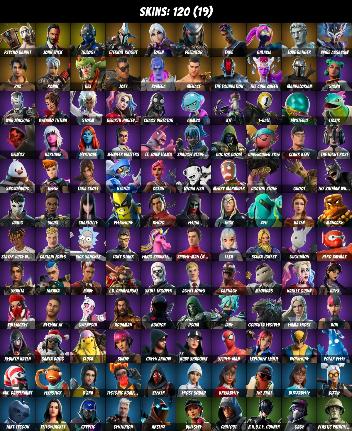 ⚡PC/PSN/XBOX⚡ 120 skins 💎 Skull Trooper 💎 Psycho Bandit 💎 John Wick 💎 Rick Sanchez 💎 Kor 💎 Gwenpool 💎 Harley Quinn 💎 Tony Stark 💎 Lara Croft 💎 Galaxia 💎 Mandalorian 💎 Spider-Man (No Way Home) 💎 Jules 💎 Fishstick 💎 Trilogy 💎 Eternal Knight 💎 200 V-Bucks 💎