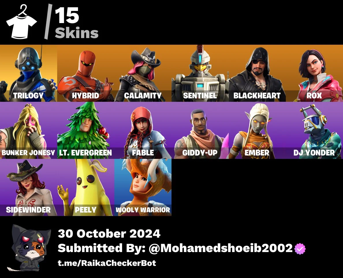 [PC/PSN/XBOX] 15 skins | Trilogy | Hybrid | Calamity | Sentinel | Blackheart | Rox | Bunker Jonesy | Lt. Evergreen | Fable | Giddy-up | Ember | DJ Yonder | 150 VB
