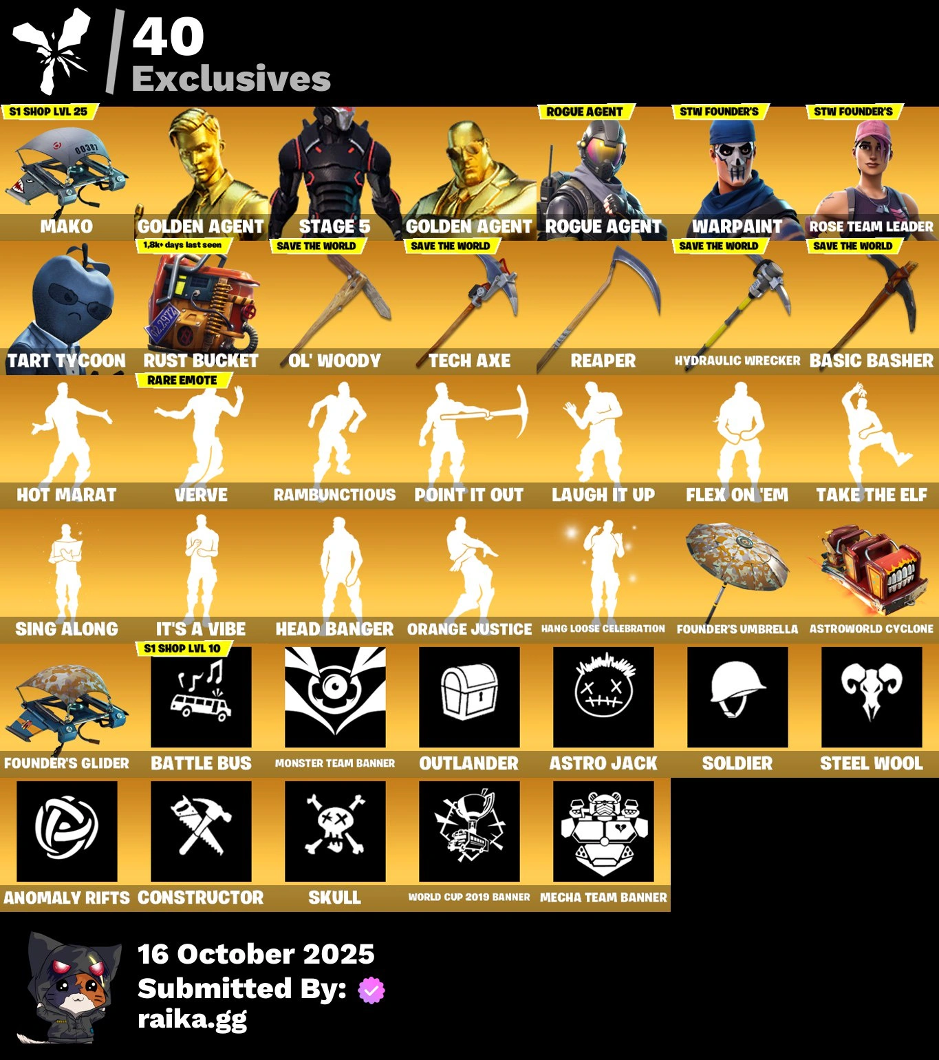[PC/PSN/XBOX] 257 skins | OG STW | GOLDEN AGENT | STAGE 5 | GOLDEN AGENT | Rogue Agent | Tart Tycoon | Luxe | Valor | Spectra Knight | Spire Assassin | Era | 3900 VB