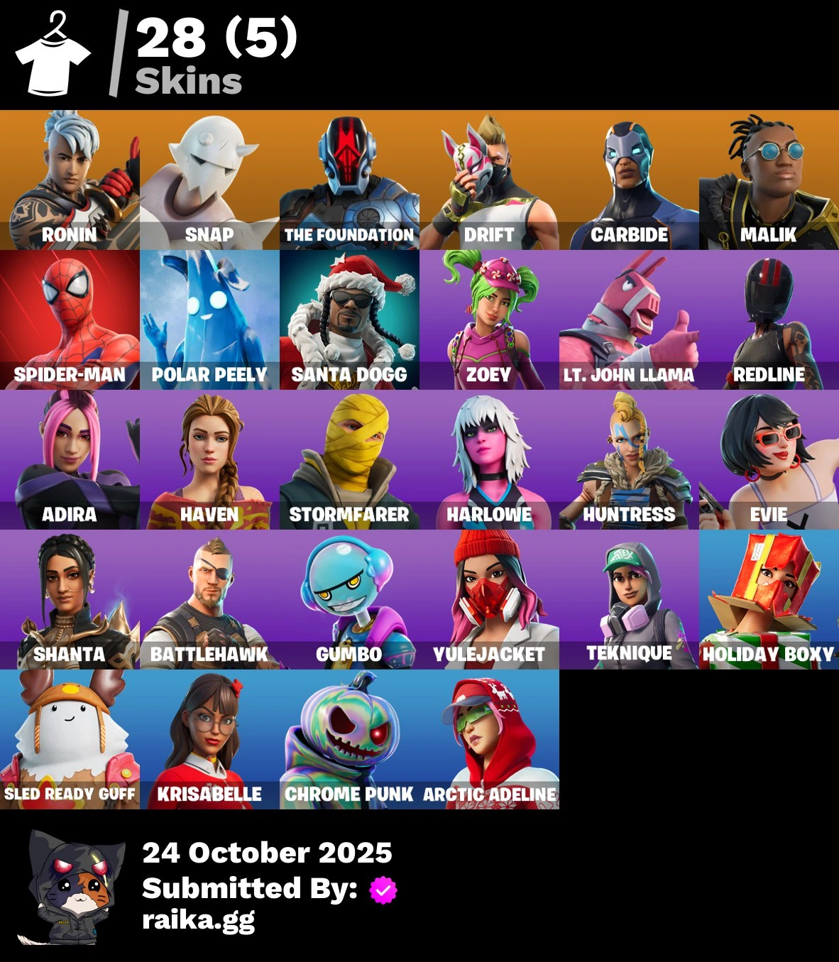 [PC/PSN/XBOX] 28 skins | Ronin | Snap | The Foundation | Drift | Carbide | Malik | Spider-Man | Polar Peely | Santa Dogg | Zoey | Lt. John Llama | Redline | 100 VB