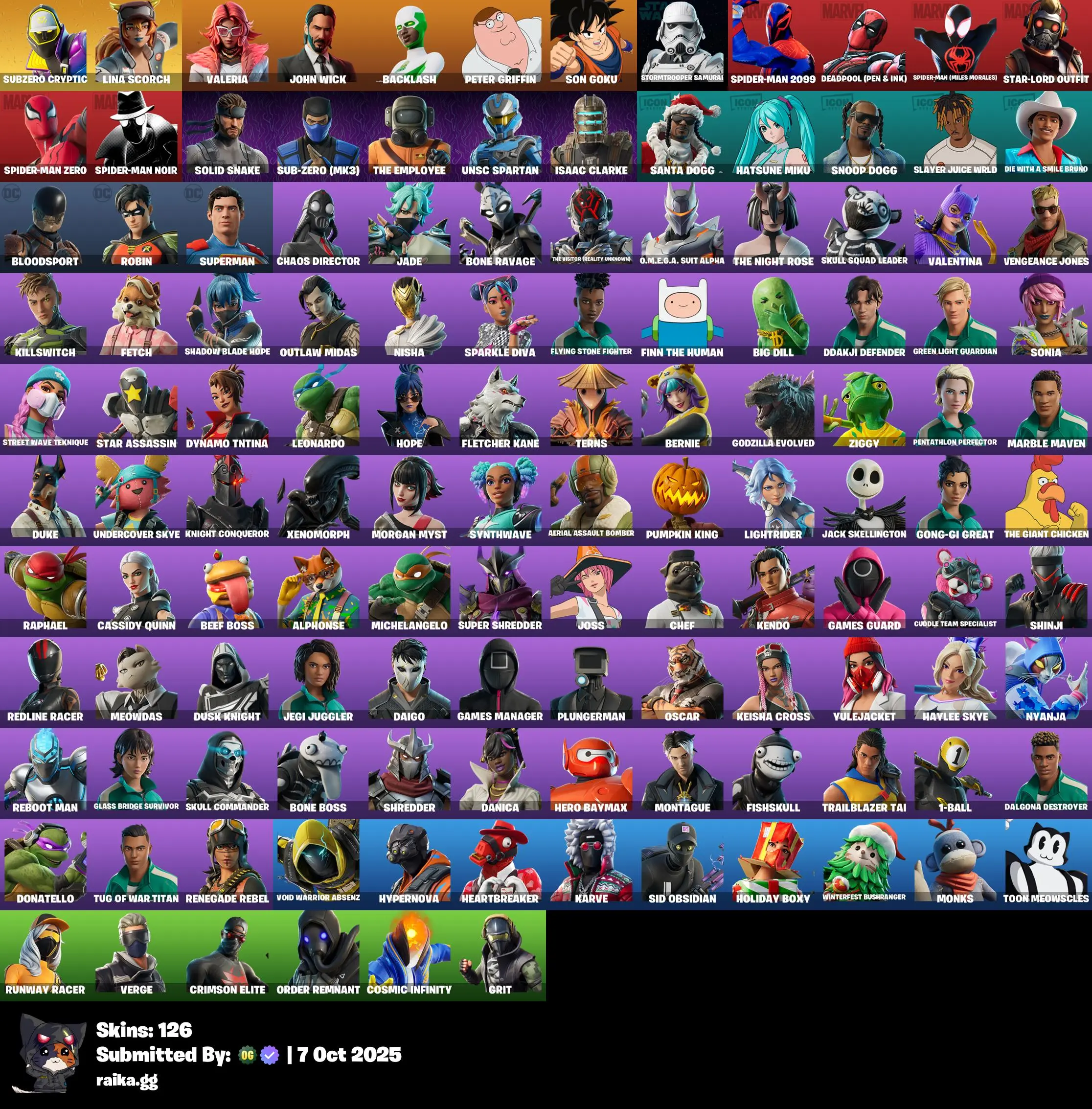 [PC/PSN/XBOX] ( Parental ) 126 skins | Subzero Cryptic | Lina Scorch | Valeria | John Wick | Backlash | Peter Griffin | Son Goku | Stormtrooper Samurai | Spider-Man 2099 | 100 VB