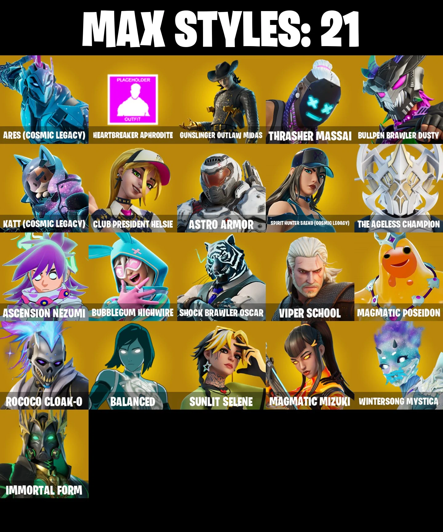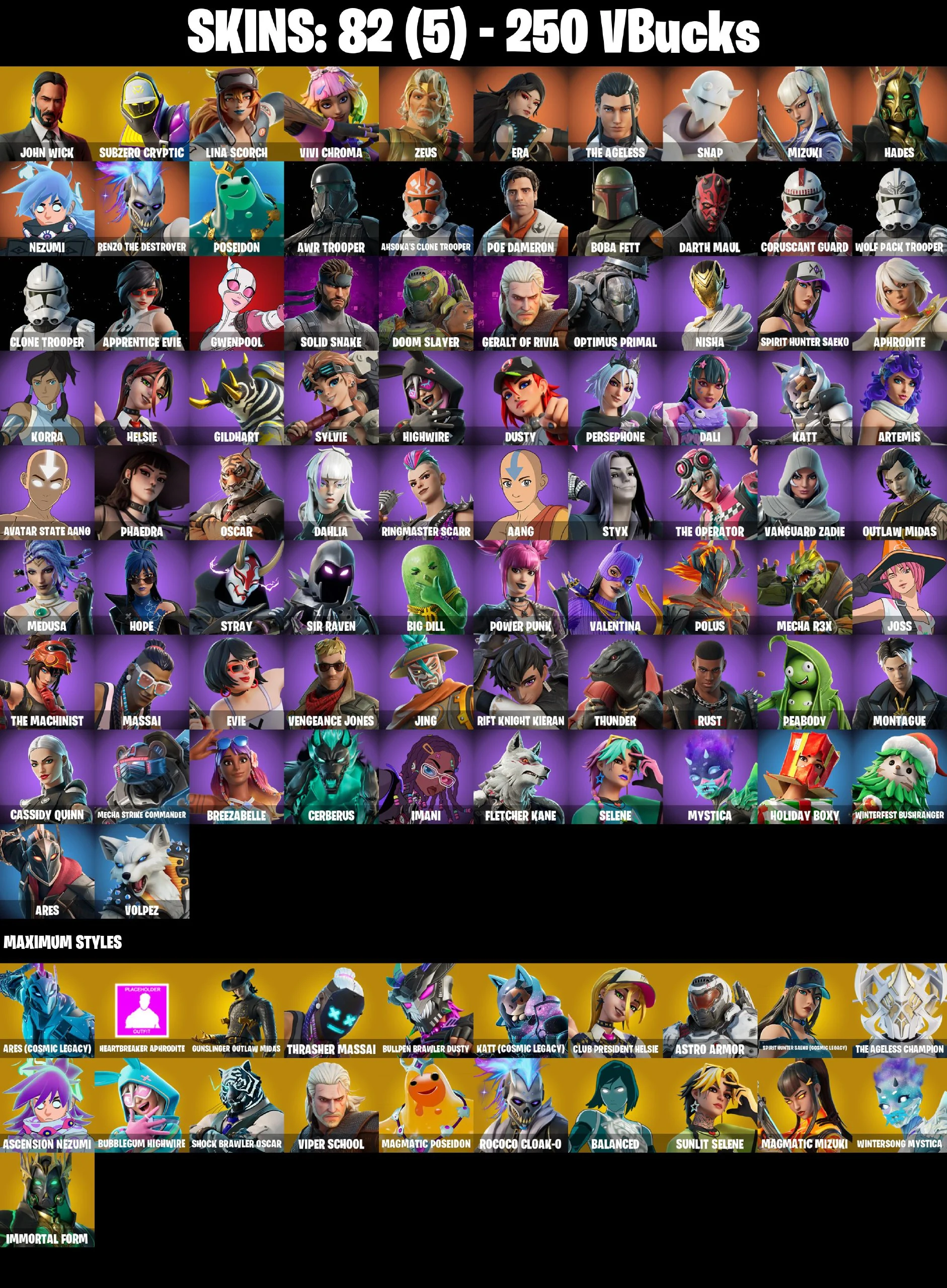 ⭐ [PC/PSN/XBOX/NINTENDO/MOBILE] 82 SKINS | JOHN WICK | SUBZERO CRYPTIC | LINA SCORCH | VIVI CHROMA | ZEUS | ERA | THE AGELESS | SNAP | MIZUKI | HADES | NEZUMI | RENZO THE DESTROYER | POSEIDON | AWR TROOPER | AHSOKA'S CLONE TROOPER | 250 VBUCKS | EMAIL