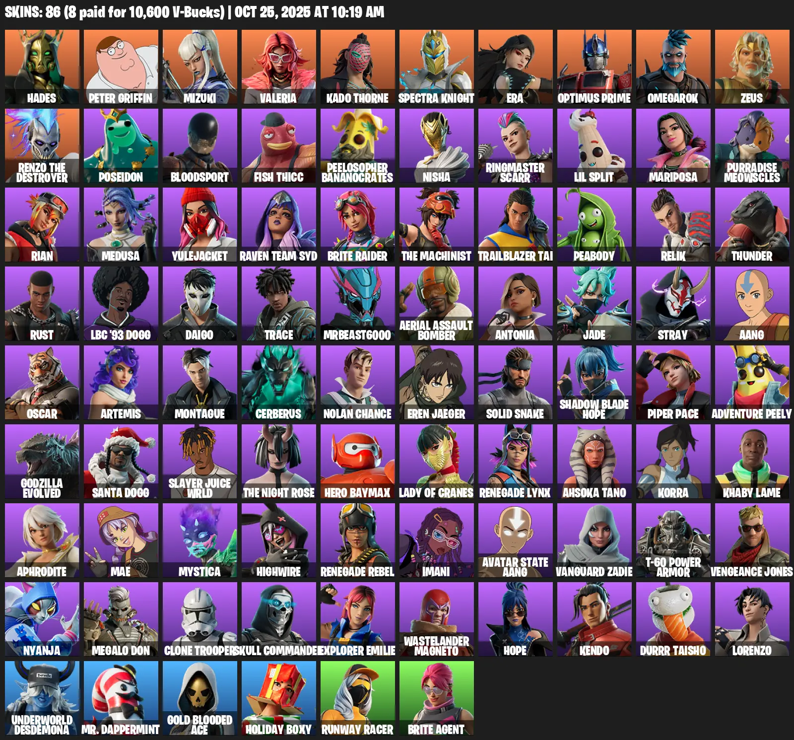 [PC/XBOX] | 86 skins | Hades | Peter Griffin | Mizuki | Valeria | Kado Thorne | Spectra Knight | Era | Optimus Prime | Omegarok | #YEB9879 | #MBFN