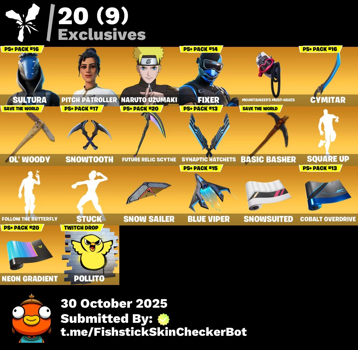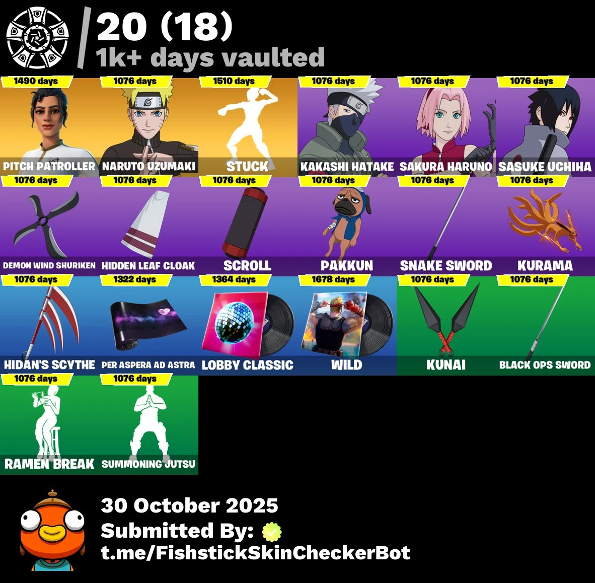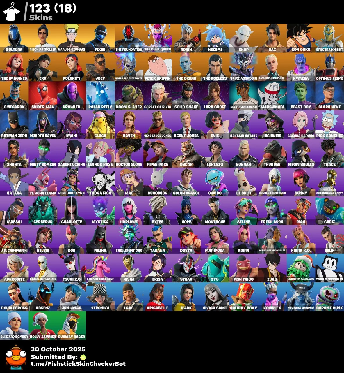 [PC/XBOX/NINTENDO] 123 skins | Naruto Uzumaki | Sakura | Sasuke | Kakashi | Sultura | Pitch Patroller | Fixer | The Foundation | The Cube Queen | Ronin | Nezumi | Snap | Raz | Son Goku | 550 VB