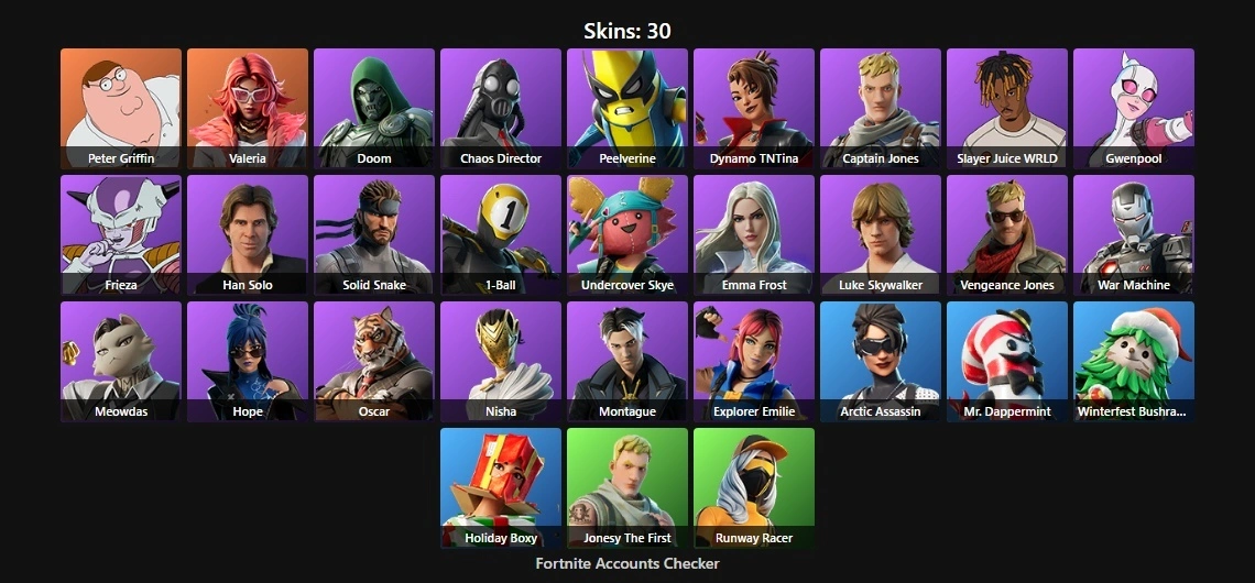 PC/XBOX/PSN 30 Skins⚡ | Peter Griffin | Valeria | Doom | Chaos Director | Peelverine | Dynamo TNTina | Captain Jones | Slayer Juice WRLD | Gwenpool | Frieza