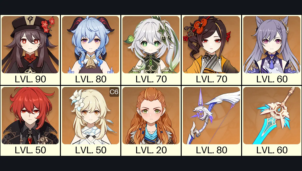 💙[Asia] AR 53 💙 10x Five Stars 💙 38 Chars 💙 Hu Tao & Ganyu & Chiori & Nahida & Keqing & Diluc 💙