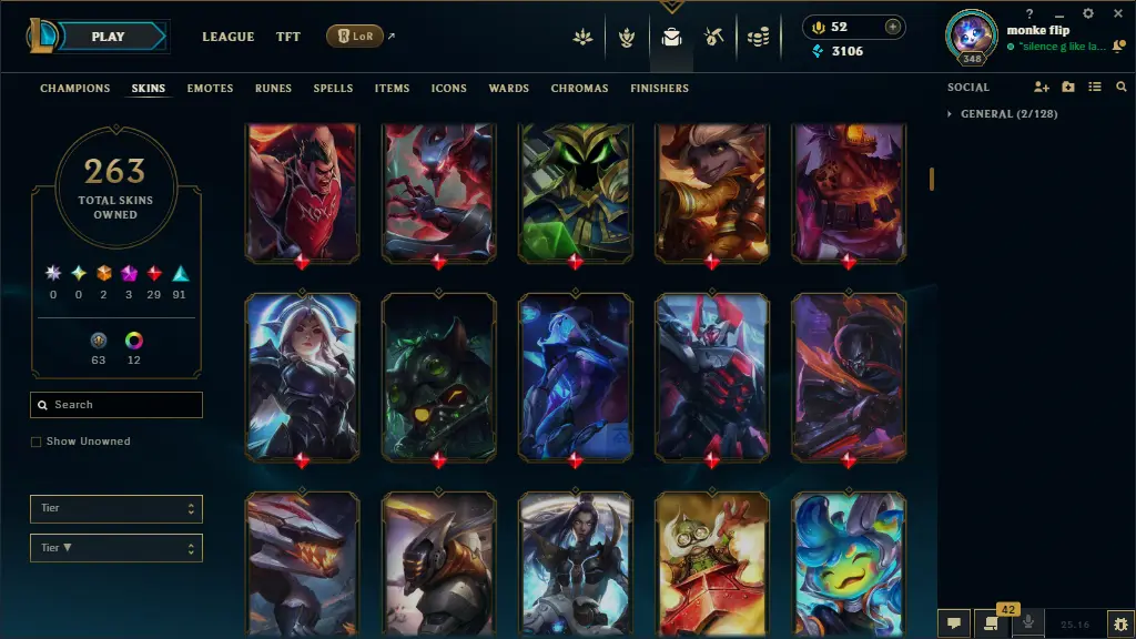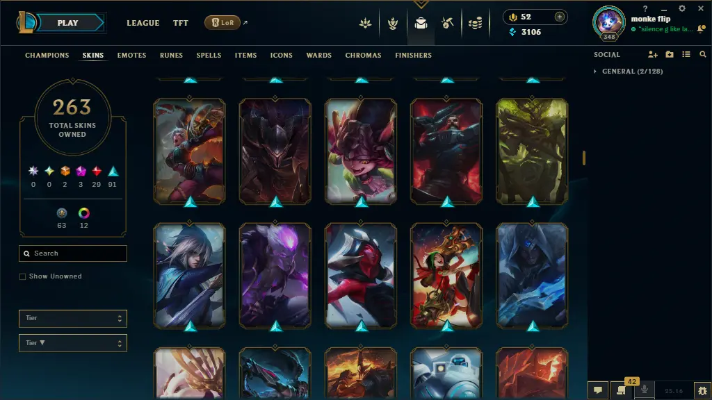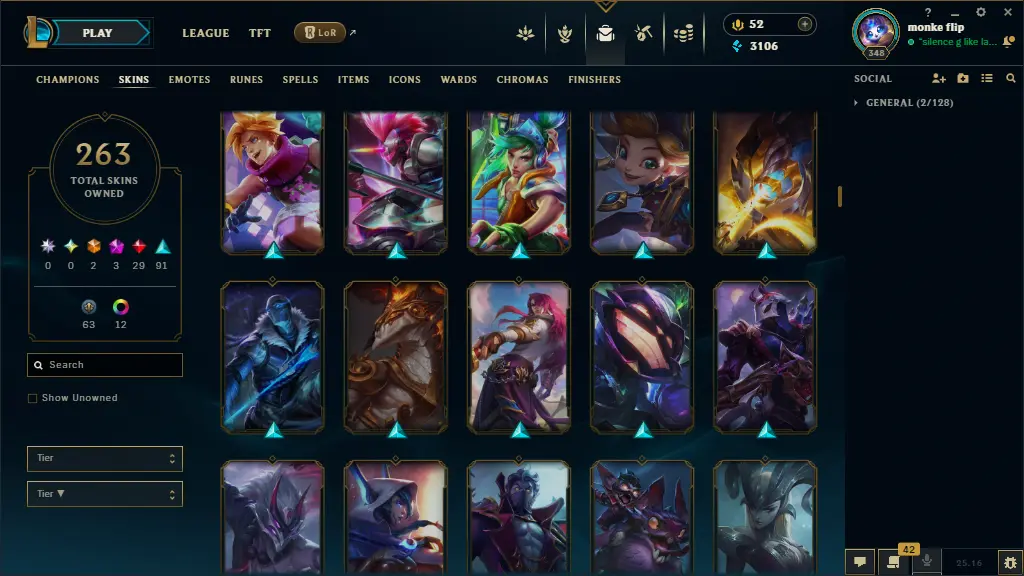 【EUW】– Level 348 🎮 Unranked 🏅 – 263 Skins 🎨 [3,106 BE 💎 | 52 RP 🔥] – Honor 3 🌟 – 164 Champs ⚔️