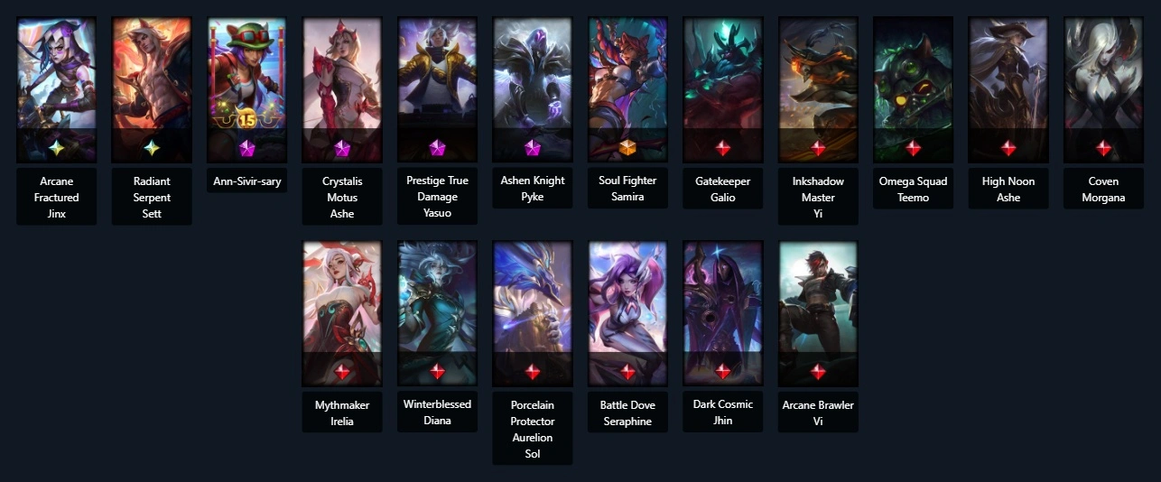 UnRanked┃58 skins┃140 Champs┃(4 Mythic) Arcane Fractured Jinx Radiant Serpent Sett Ashen Knight Pyke Prestige True Damage Yasuo Crystalis Motus Ashe Battle Dove Seraphine Winterblessed Diana