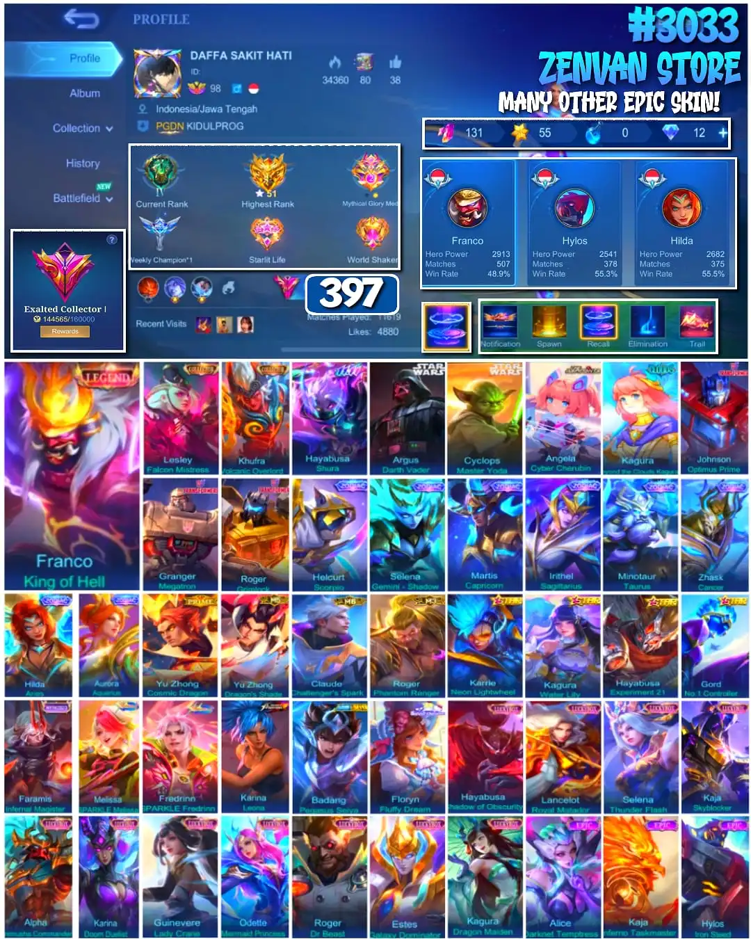 #3033 🔥 397 Skins 🔥 Legend Franco 🔥 Collector Lesley, Kufra 🔥 11.11 Hayabusa 🔥 StarWars Argus & Cyclops 🔥 Aspirant Angela 🔥 Transformers Jhonson, Granger, Roger 🔥 Prime Yu Zhong 🔥 KoF Karina 🔥 Many Limited 🔥 Many Zodiak 🔥 Many Epic 🔥 Safe Account ✅
