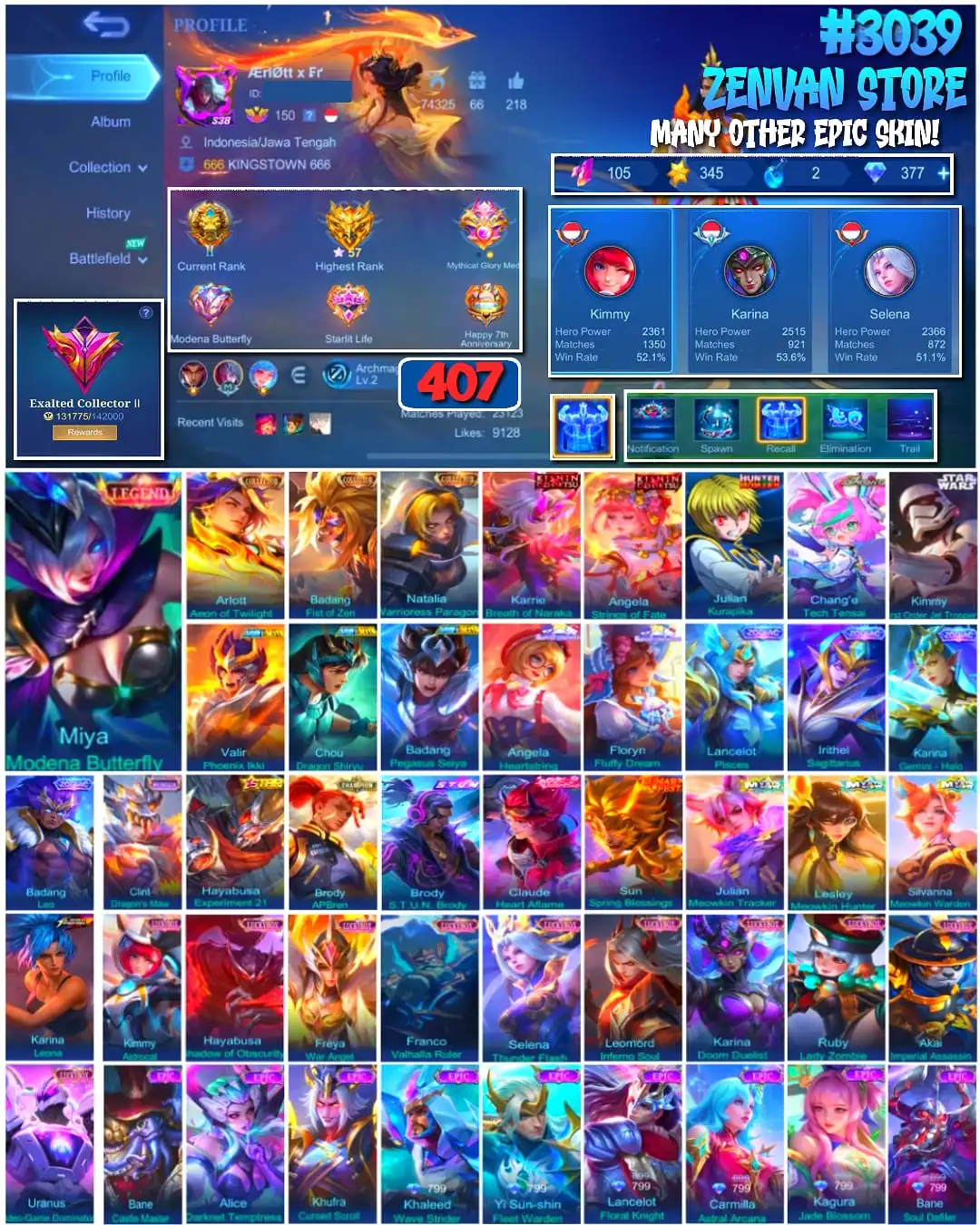 #3039 🔥 407 Skins 🔥 Legend Miya 🔥 Collector Arlot, Badang, Natalia 🔥 Kinsin Karrie & Angela 🔥 HunterXHunter Kurapika 🔥 StarWars Kimmy 🔥 Full Seint Seiya 🔥 Many Limited 🔥 Many Zodiak 🔥 Many Epic 🔥 Safe Account ✅