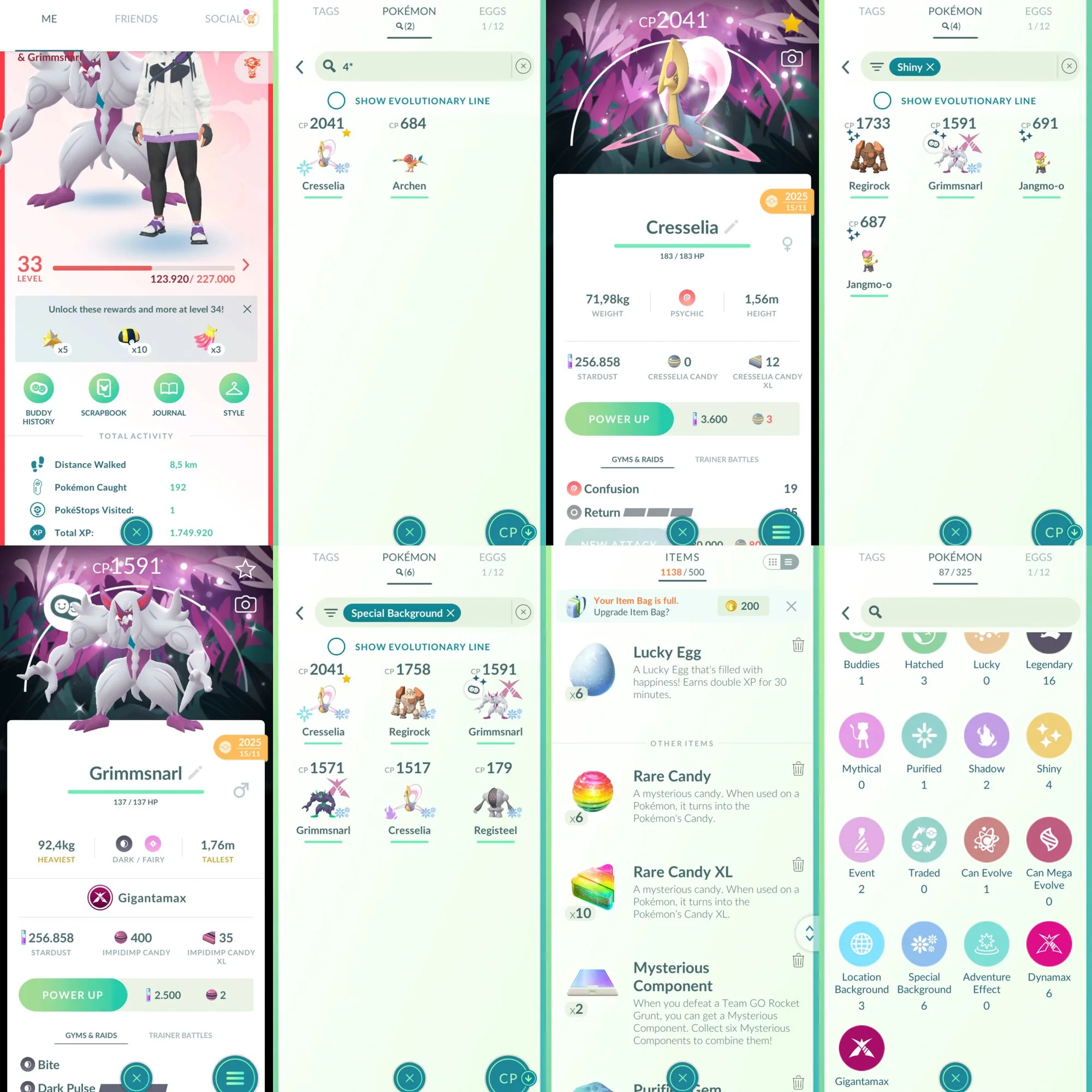 Level 33+; Cresselia iv100;16 legend- 276K+ Stardust- shiny Grimmsnarl background can trade-4 shiny-6 dynamx-6 Special BG-10 Gmax-3 Location BG