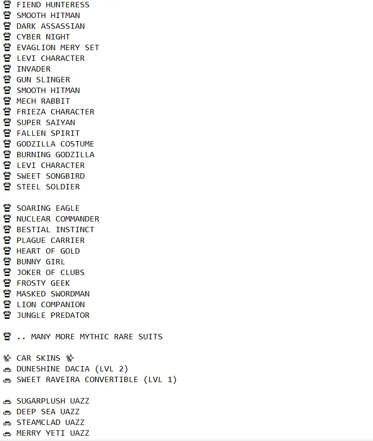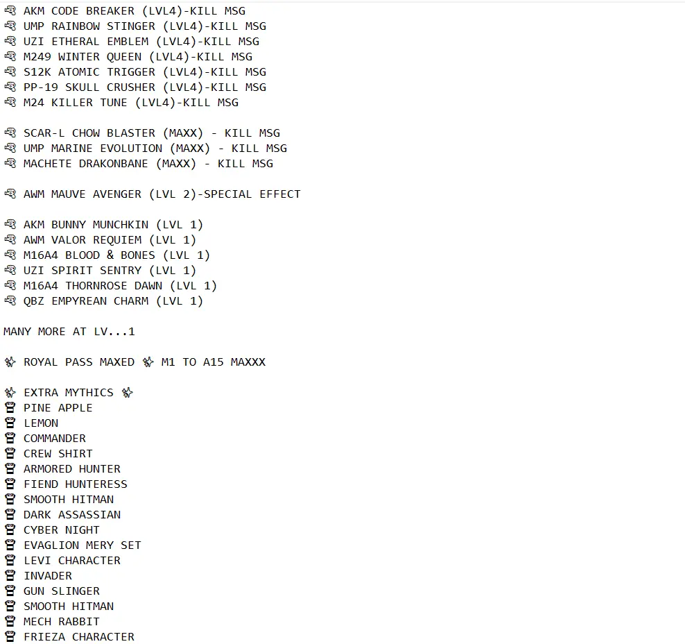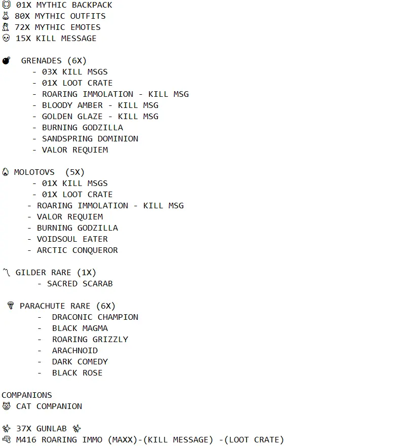 👑 ANUKHRA + DRAVION (⭐⭐⭐) 🔫 M416 ROARING IMMOLATION MAXX 🎁 LOOT CRATE 💎 RARE 🍍 PINEAPPLE 🍋 LEMON 🧢 COMMANDER SET 👕 CREW SHIRTS 💥 37x GUNLAB 💀 15x KILL MESSAGES 💣 GERNADE MOLEE 🔥 EMOTES 🎭 MYTHICS 💎 HELMETS 🪖 BACKPACKS ✨ SECURE 🔐