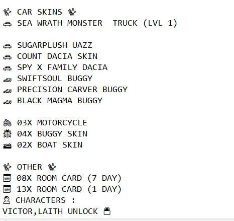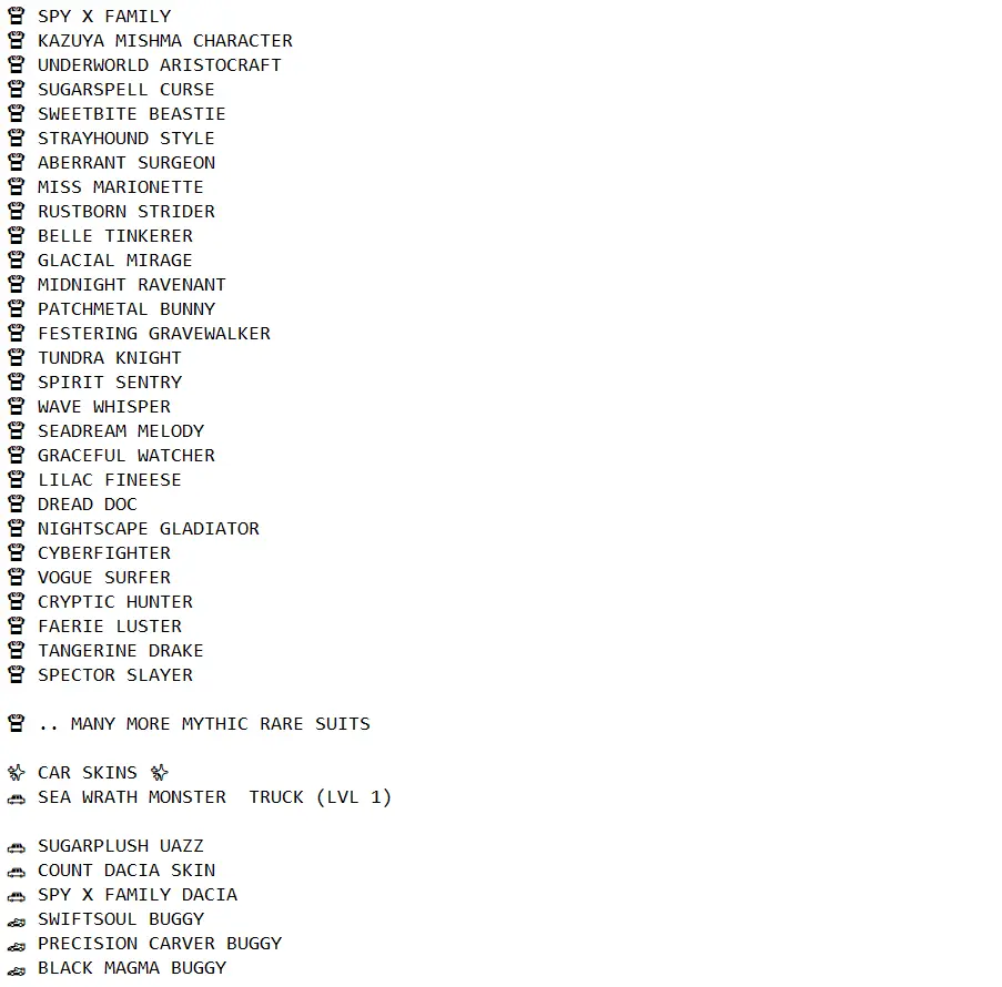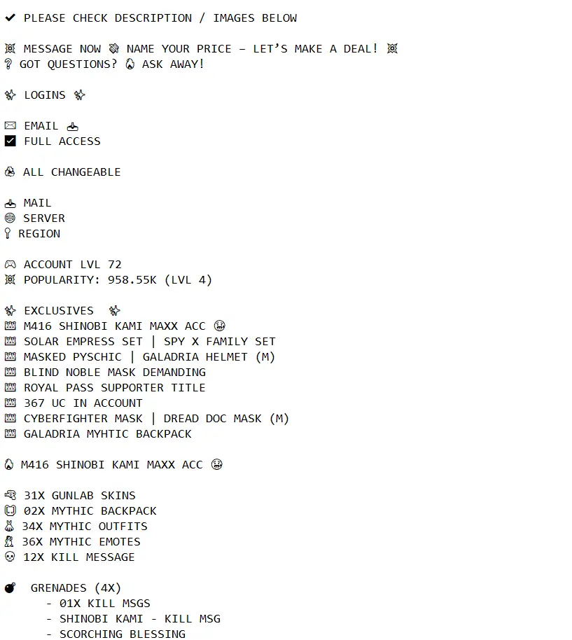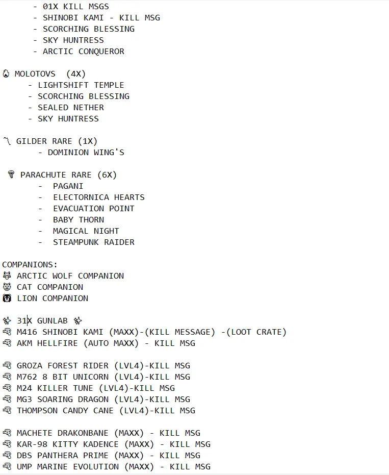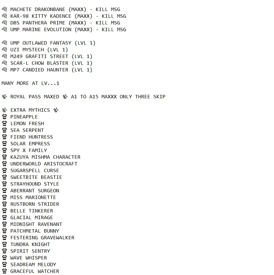 🍍 RARE PINEAPPLE + 🍋 LEMON SETS 🔫 (M416 SHINOBI KAMI + AKM HELL FIRE) MAXX 🎁 LOOT CRATE 👑 SOLAR EMPRESS + 🕵️♂️ SPY X FAMILY SET 💥 31x GUNLAB 💀 12x KILL MESSAGES 💣 GERNADE MOLEE 🔥 RARE EMOTES 🎭 MYTHICS 💎 HELMETS 🪖 BACKPACKS ✨ SECURE 🔐
