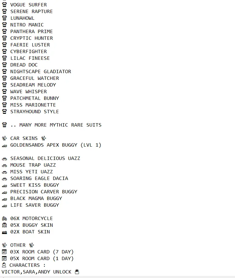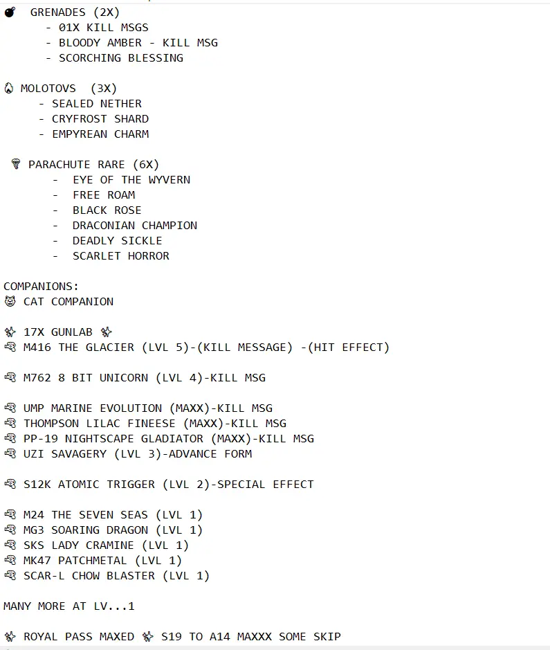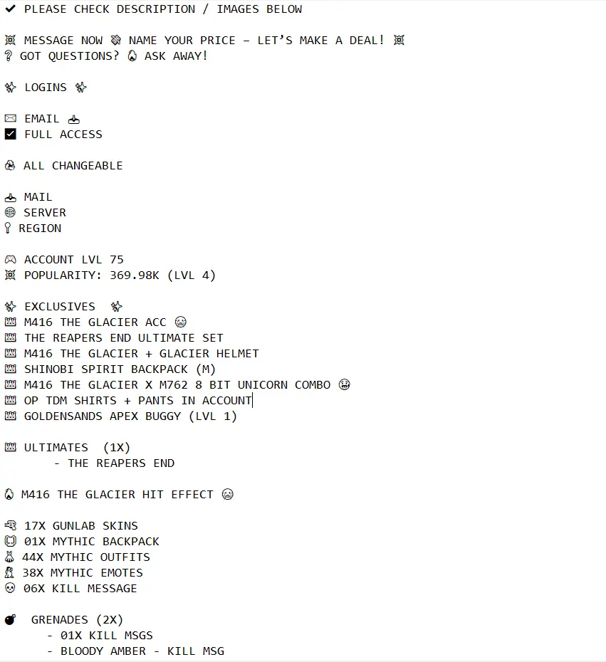☠️ REAPERS END ULTIMATE 🔫 M416 GLACIER X M762 8BIT UNICORN ⚔️ KILL MSG 💥 17x GUNLAB 💀 6x KILL MESSAGES 👕👖 OP TDM SHIRTS + PANTS 🎒 SHINOBI SPIRIT BACKPACK 🔥 RARE EMOTES 🎭 MYTHICS 💎 HELMETS 🪖 BACKPACKS 🎒 PARACHUTES ✨ SECURE 🔐