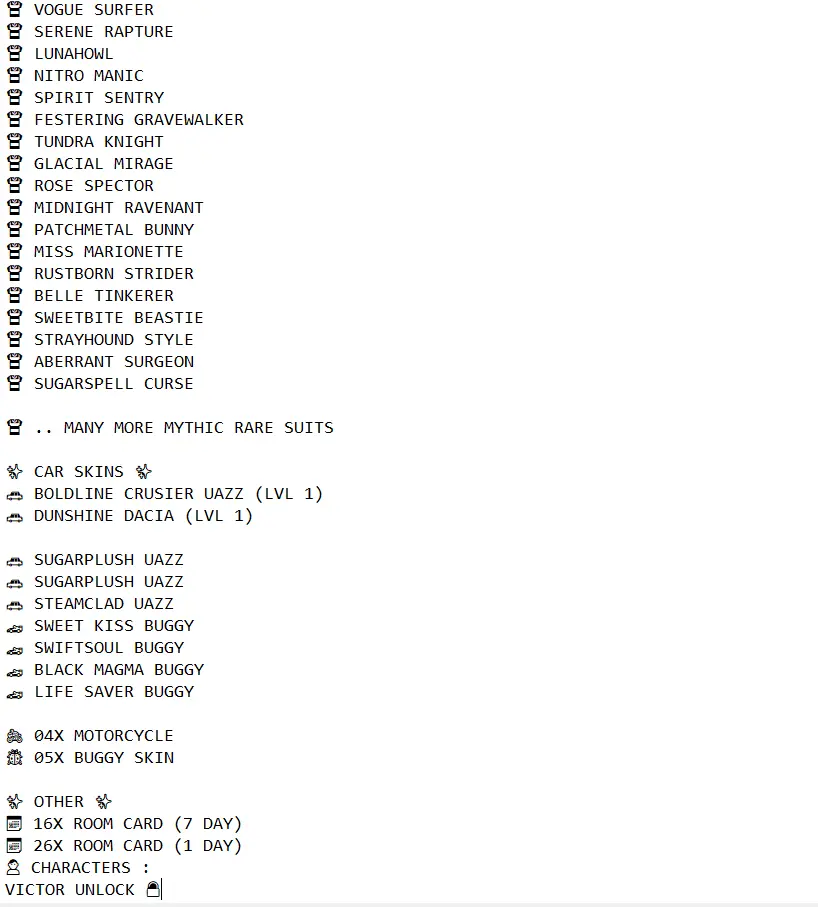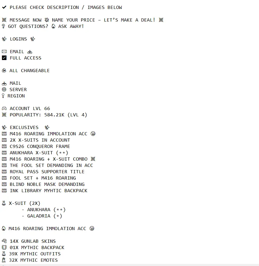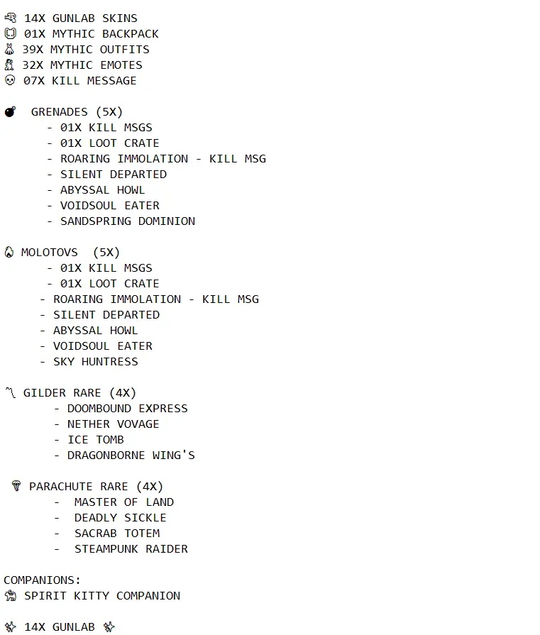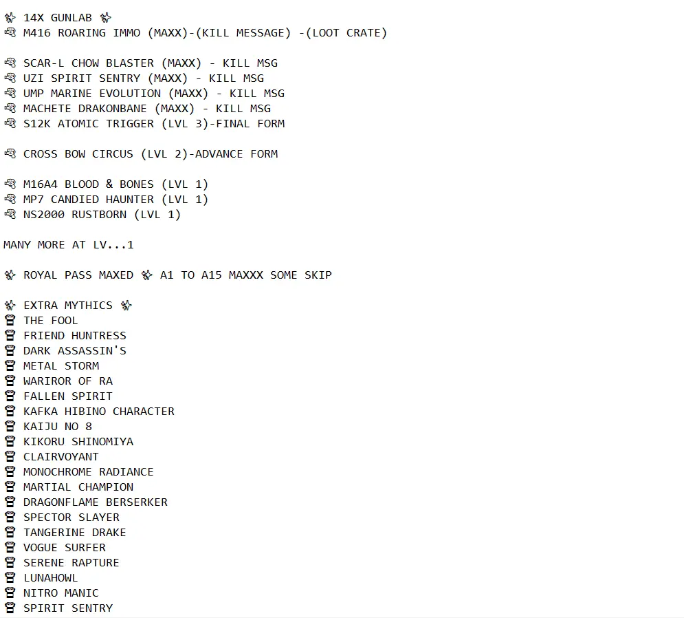 👑 X SUIT ANUKHARA (⭐⭐) ✨ + GALADRIA (⭐) 🔫 M416 ROARING IMMOLATION MAXX 🎁 LOOT CRATE 💥 14X GUNLAB 💀 7X KILL MESSAGES 🚄 RARE TRAIN GLIDER 🤡 FOOL SET 🎒 INK MYTHIC BACKPACK 🏆 CONQUEROR 💣 GERNADE MOLEE 🔥 RARE EMOTES 🎭 MYTHICS 💎 HELMETS ✨ SECURE 🔐