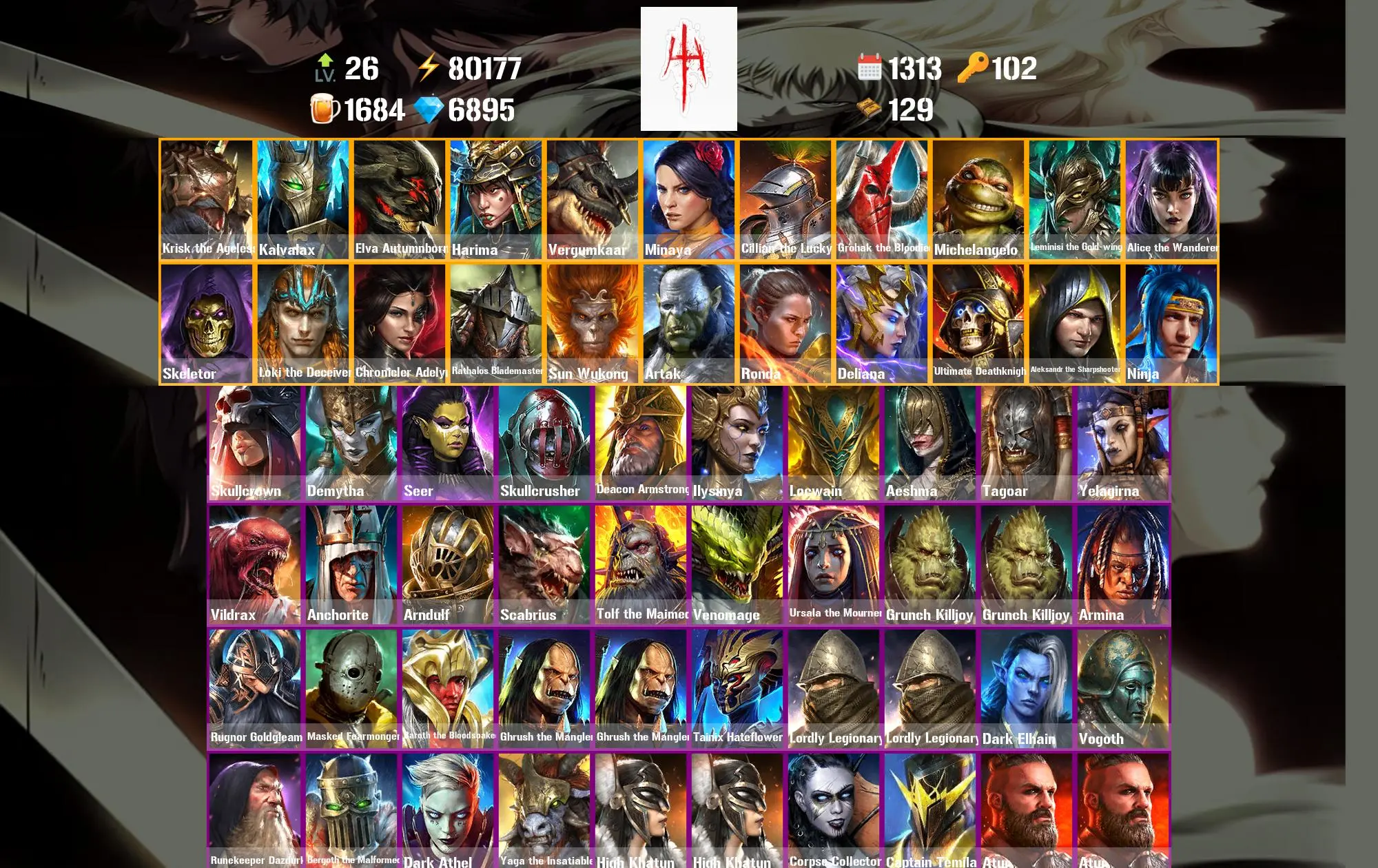 1313 Days 80.2k Energy Krisk the Ageless ⸱ Kalvalax ⸱ Elva Autumnborn ⸱ Harima ⸱ Vergumkaar ⸱ Skullcrown ⸱ Demytha ⸱ 52.7m Silver ⸱ 6.9k Gems