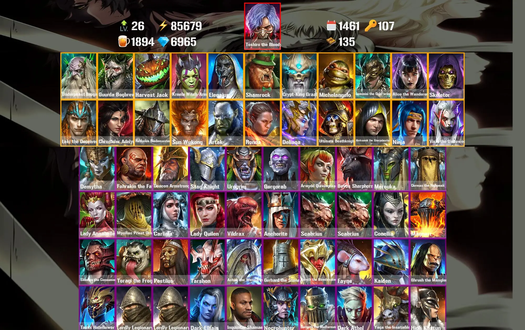 1461 Days 85.7k Energy [Mythical Starter] Toshiro the Bloody ⸱ Underpriest Brogni ⸱ Guurda Bogbrew ⸱ Harvest Jack ⸱ Kreela Witch-Arm ⸱ Elegaius ⸱ Demytha ⸱ Fahrakin the Fat ⸱ 54.5m Silver ⸱ 7.0k Gems