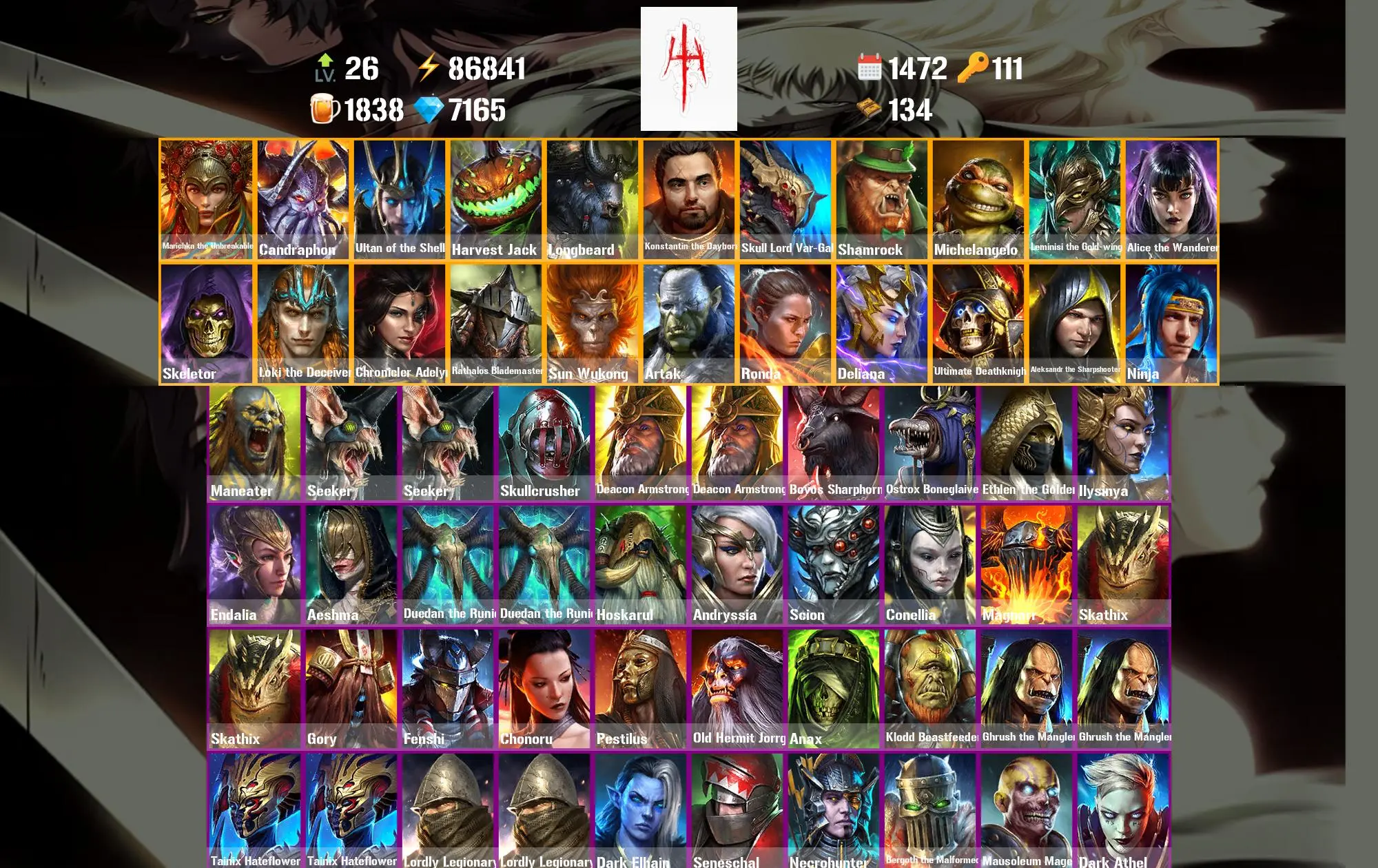 1472 Days 86.8k Energy Marichka the Unbreakable ⸱ Candraphon ⸱ Ultan of the Shell ⸱ Harvest Jack ⸱ Longbeard ⸱ Maneater ⸱ Seeker ⸱ 55.0m Silver ⸱ 7.2k Gems