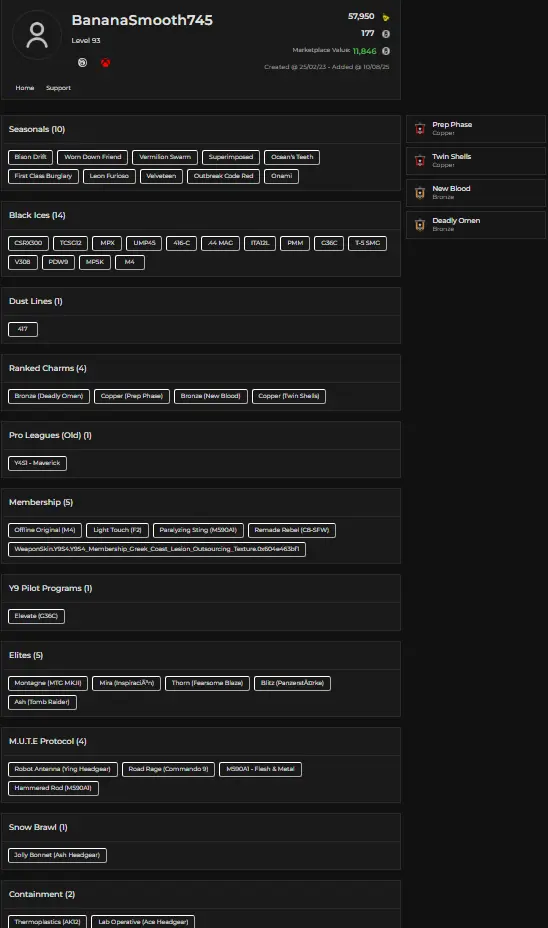💻 PC | 🎯 Level 93 | 🧊 14x Black Ices | 🪨 1x Dust Line | 🍁 10x Seasonals | 🎖️ Old Pro League (1) | 🥷 5x Elites | 🌊 Onami Skin | 💎 57,950 Renowns | 🔐 Full Access | ⚔️ Ranked Ready