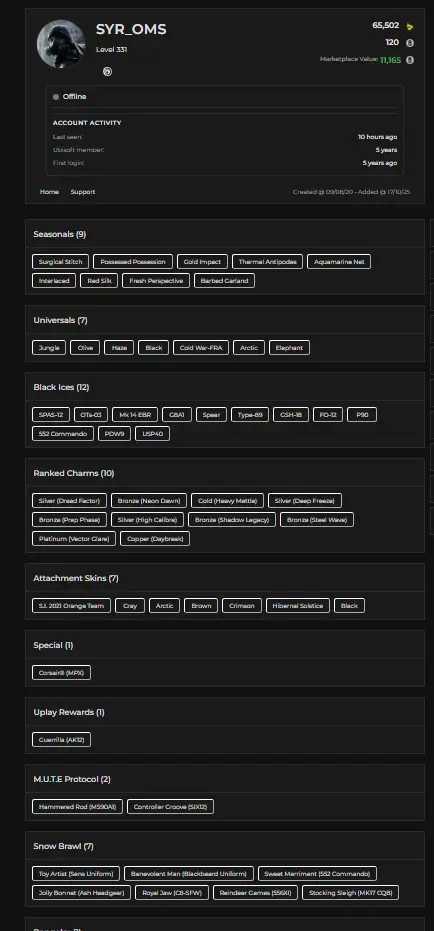 🎮 PC/Ubisoft ● Level 331 ● Ultimate BLACK ICE Veteran 💎 ● 12x BLACK ICE + 7x Legendary + 50x Epic Skins ● Instant Delivery ⚡