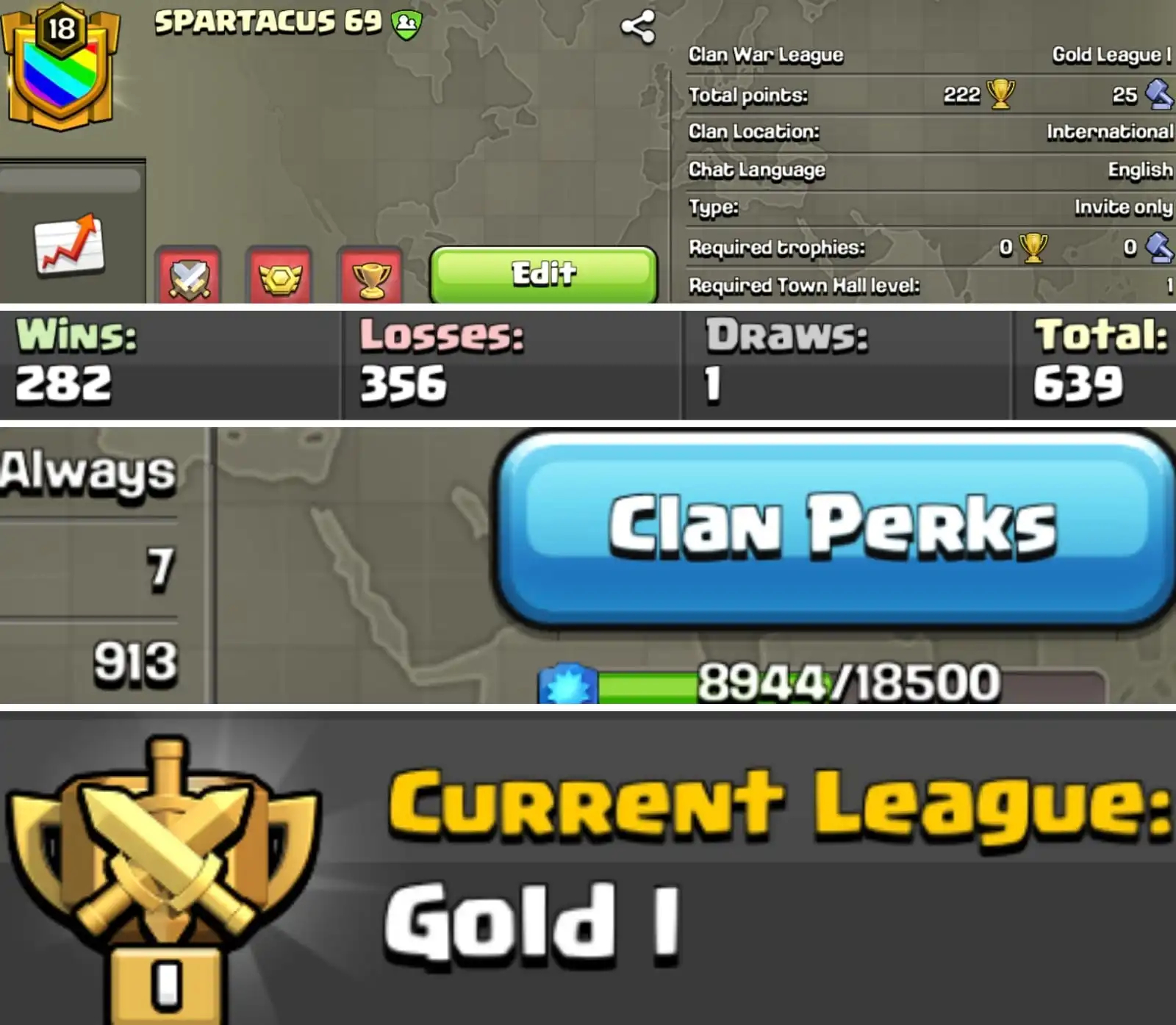 Lvl 18 - SPARTACUS 69 | Clan Capital 9 | Cwl : Gold 1 | War Log { 282 : 356 } | Instant Delivery unless sleeping