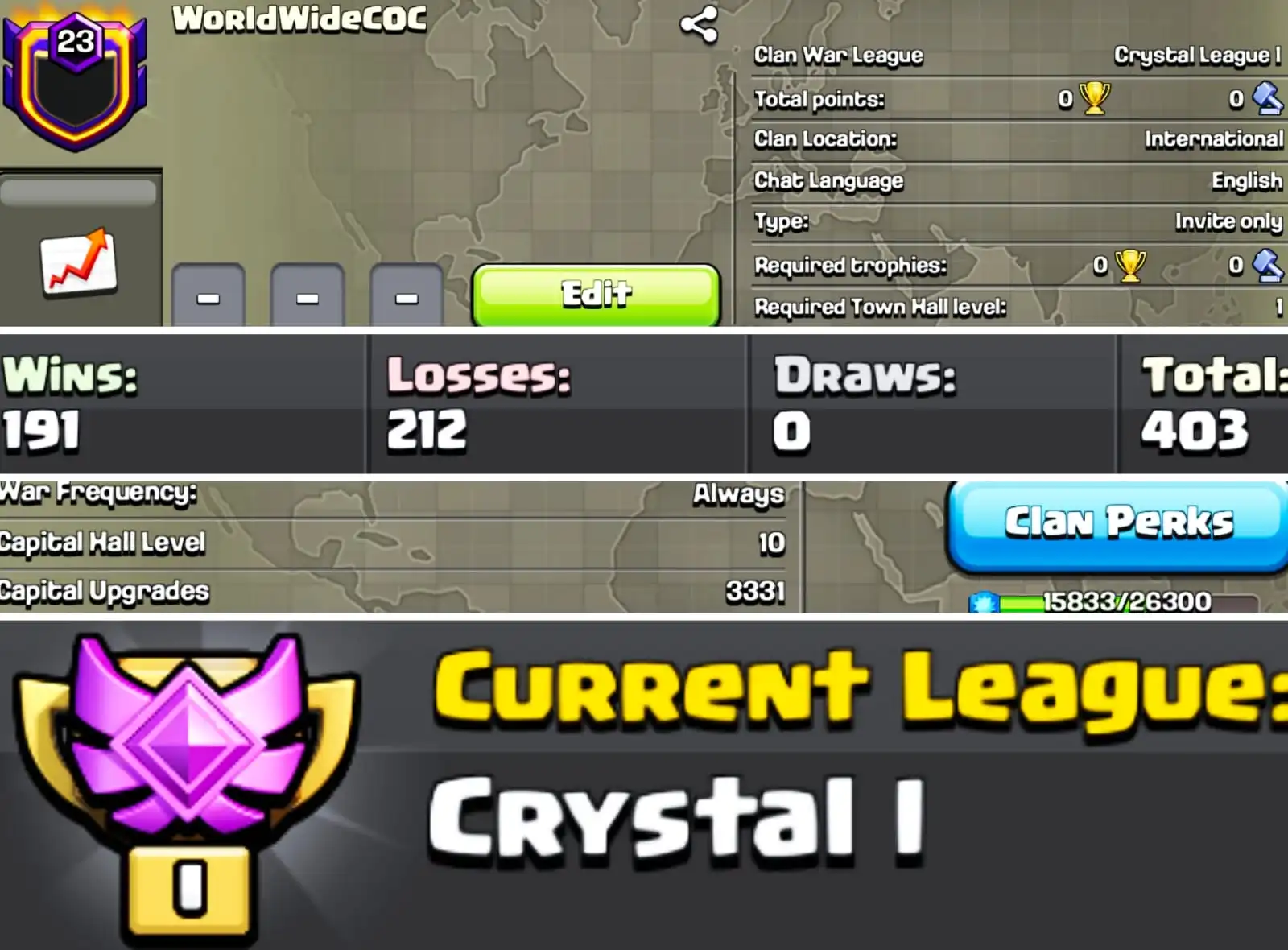 Clan Capital 10 Max | Lvl 23 - WorldWideCOC | CWL : Crystal 1 | War Log { 191 : 212 } | Instant Delivery unless sleeping
