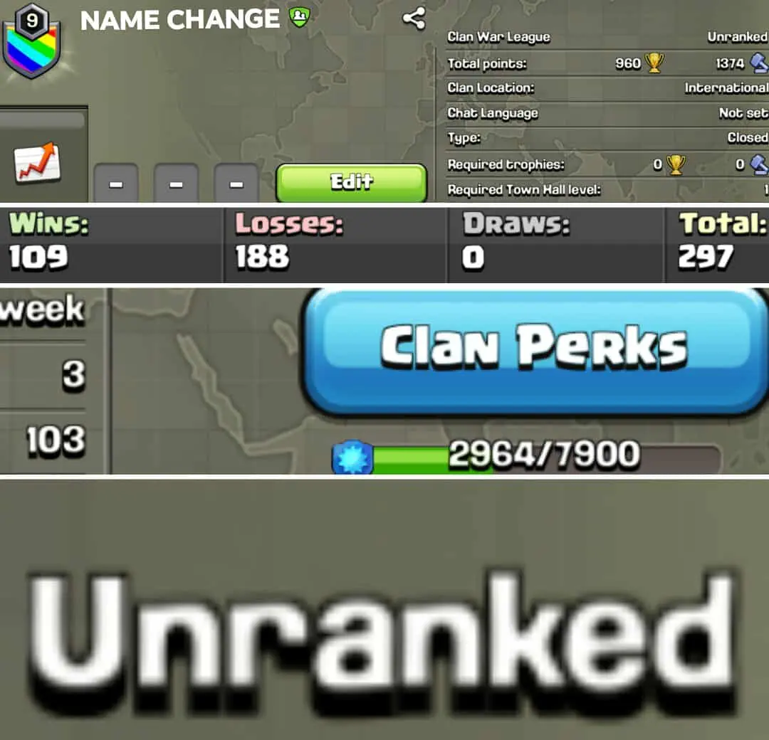 Lvl 9 Name Change Clan | Clan Capital 3 | Unranked | War Log { 109 : 188 } | Instant Delivery unless sleeping