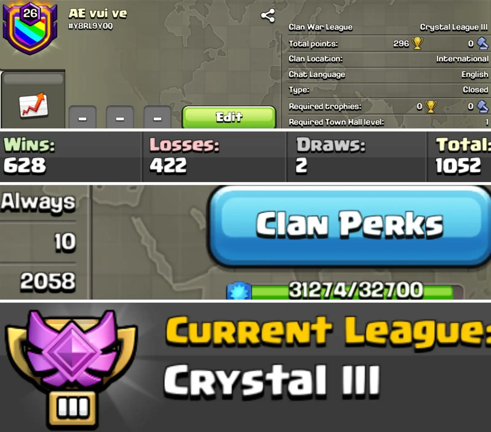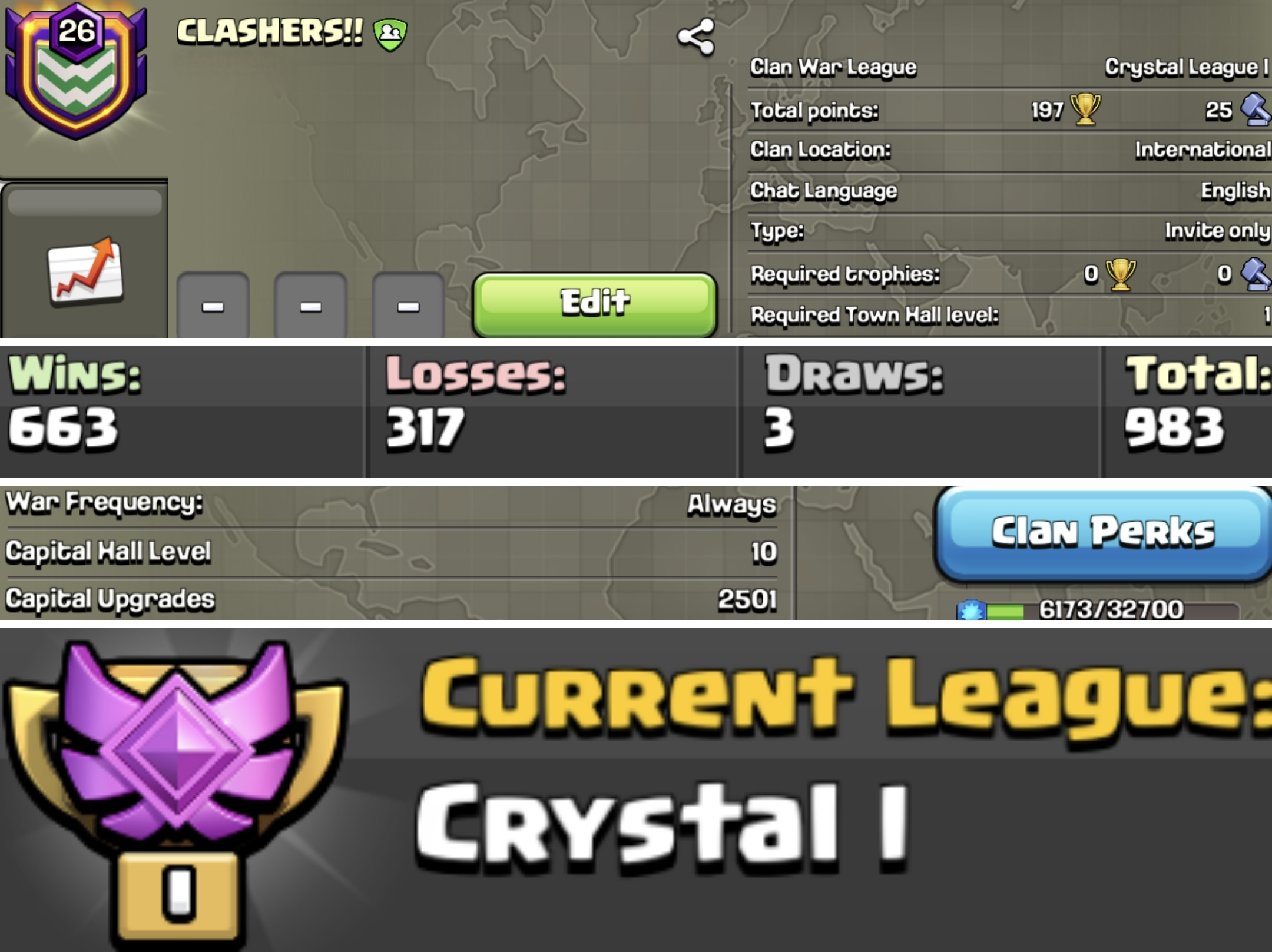 Clan Capital 10 Max 3331 | Lvl 24 - Black Sparrow | CWL : Crystal 2 | War Log { 237 : 280 } | Instant Delivery unless sleeping