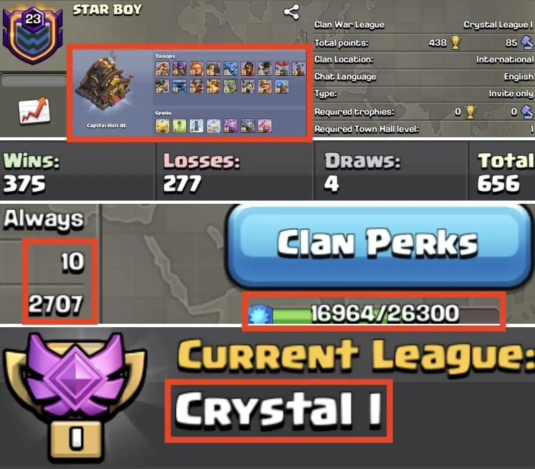 STAR BOY Lvl 23 | Clan Capital 10 | CWL : Crystal 1 | War Log { 375 : 277 } | Instant Delivery unless sleeping